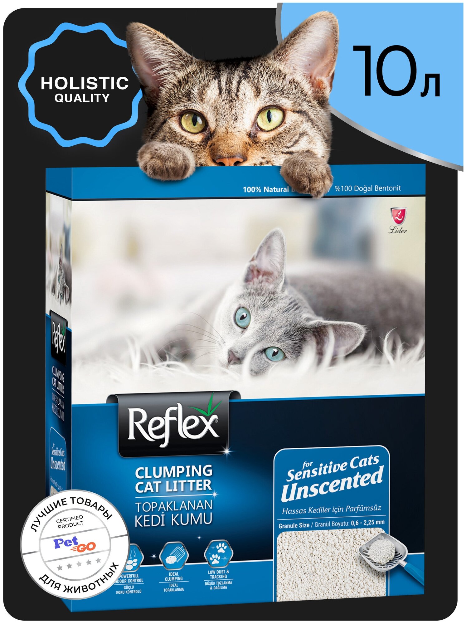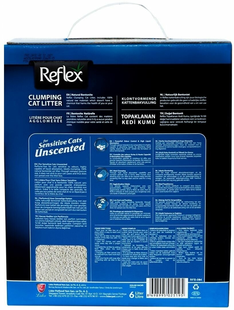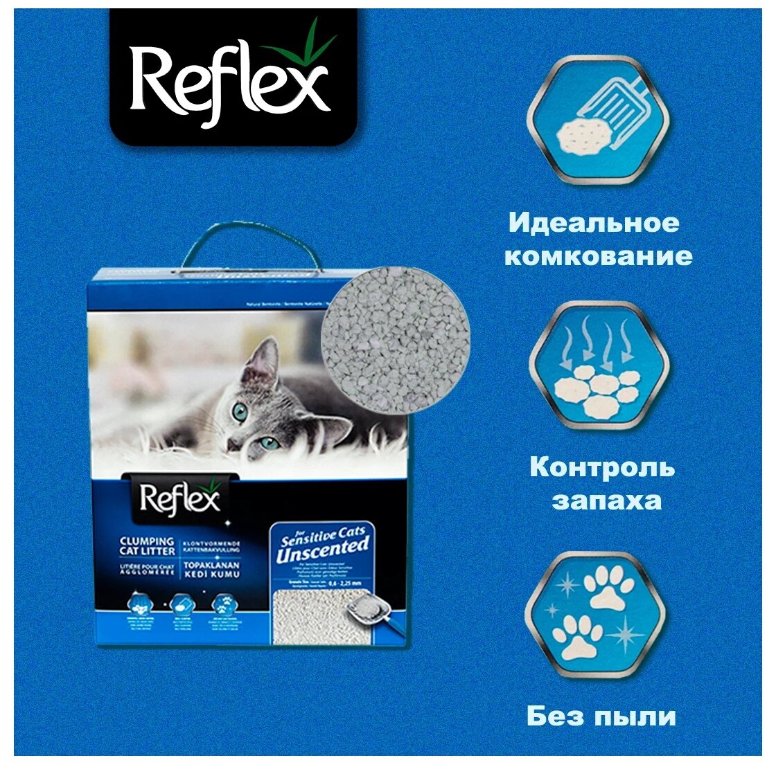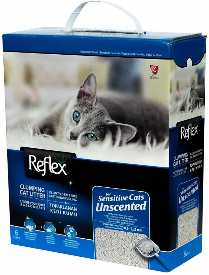 Reflex - это элитная серия высококачественных комкующихся наполнителей с уникальными свойствами. Производится из специально обработанной и очищенной от пыли глины. Гранулы наполнителя обладают уникальными впитывающими свойствами и содержат активный компонент - специально обработанный активированный уголь, который максимально уничтожает неприятный запах. Наполнитель Reflex не только отлично впитывает, но и образует крепкие, удобные для уборки комки, обеспечивая продолжительную свежесть в доме. Не содержит ароматизатор, подходит для кошек и людей, чувствительных к ароматизаторам.