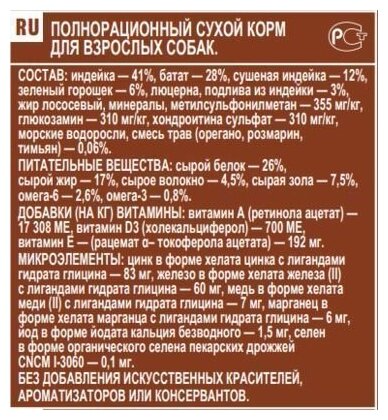 | Состав | Состав: 56% индейки ( в том числе индейка (35%), сушеная индейка (21%)), батат (28%), горох (11%), люцерна, жир лососевый, морские водоросли, глюкозамин — 355 мг/кг, метилсульфонилметан — 355 мг/кг, хондроитинсульфат — 250 мг/кг, смесь трав (майоран, базилик, орегано, шалфей, тимьян, петрушка) (0,4%), минералы. Гарантированный анализ (%): белок — 25,5%, жир — 15%, клетчатка— 4,5%, зола — 8%, омега-6 — 2,8%, омега-3 — 0,5%. Питательные добавки (на кг) |