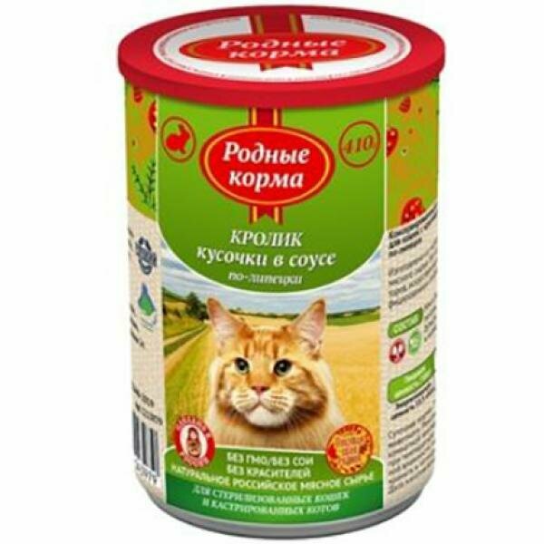 Родные Корма влажный корм для взрослых кошек с кроликом кусочки в соусе по-липецки (410 г)