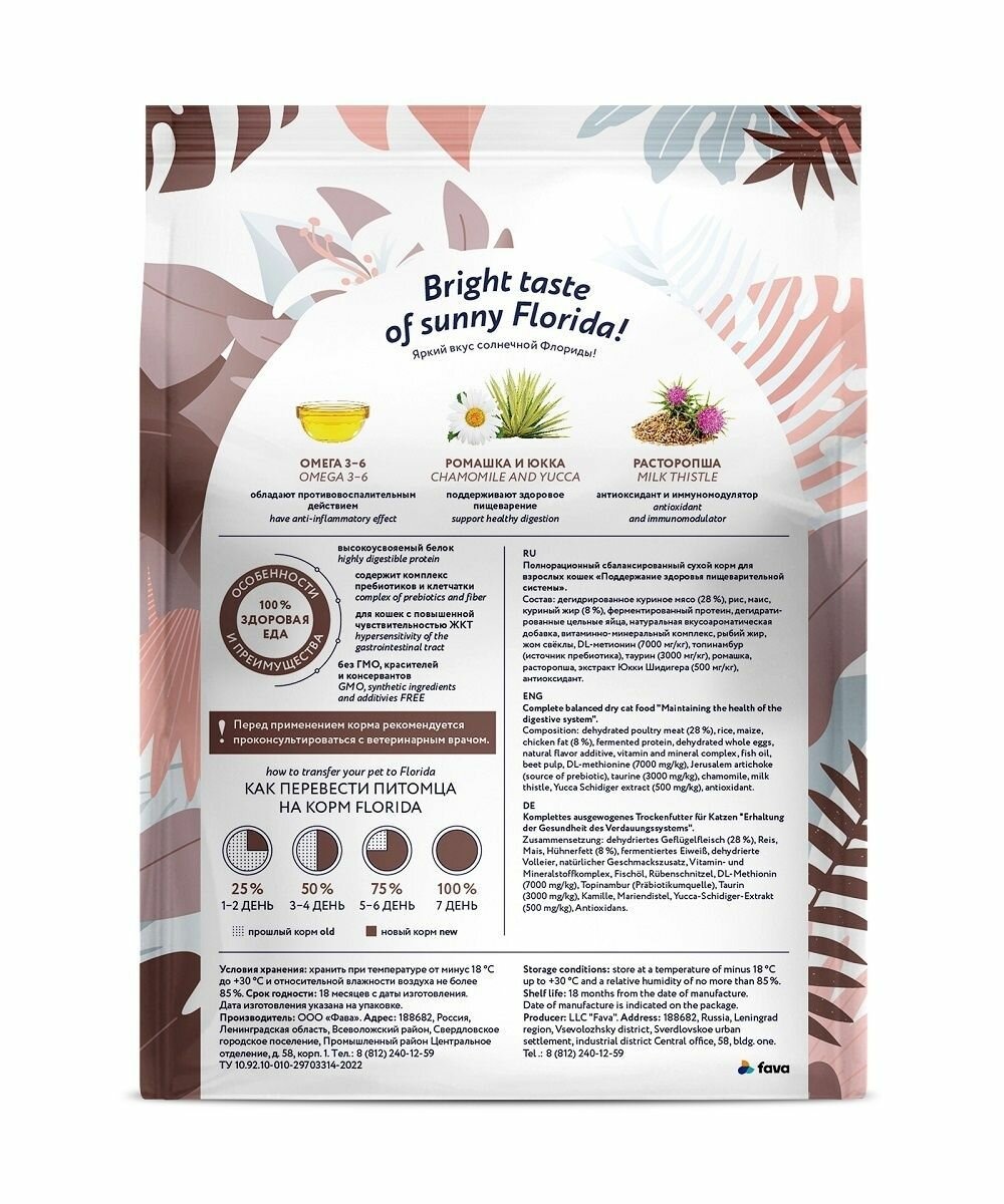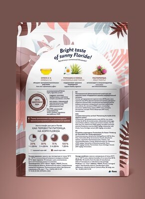 Florida Preventive Line – это линейка профилактических кормов для питомцев с разными физиологическими потребностями в питании. Рационы Florida Preventive Line содержат питательные компоненты, которые необходимы для поддержания здоровья и профилактики развития различных заболеваний у взрослых кошек и собак. Линейка Florida Preventive Line объединяет в себе природную пользу и современные технологии. Для производства используются высококачественное мясо и натуральные растительные ингредиенты, которые выращиваются и собираются вручную в экологически чистых районах России. Перед применением корма рекомендуем проконсультироваться с ветеринарным врачом. Рекомендации по кормлению: Переход с предыдущего рациона осуществлять постепенно, небольшими порциями в течение 5-7 дней. Полнорационный сбалансированный корм для кошек Florida Preventive Line Gastrointestinal предназначен для поддержания здоровой работы желудочно-кишечного тракта. Легкоусвояемые белки и высокое содержание клетчатки способствуют хорошей усвояемости диеты и нормализации перистальтики кишечника. Топинамбур - природный пребиотик, который способствует восстановлению нормальной микрофлоры. Расторопша - натуральный мощный антиоксидант, который нейтрализует свободные радикалы. Ромашка - обладает противовоспалительным действием. Юкка Шидигера - способствует угнетению условно-патогенной микрофлоры кишечника и снижению запаха фекалий.