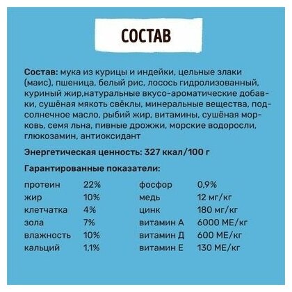 | Состав | Состав: мука из курицы и индейки, цельные злаки (маис), пшеница, белый рис, лосось гидролизованный, куриный жир,натуральные вкусо-ароматические добавки, сушеная мякоть свеклы, минеральные вещества, подсолнечное масло, рыбий жир, витамины, сушеная морковь, семя льна, пивные дрожжи, морские водоросли, глюкозамин, антиоксидант |