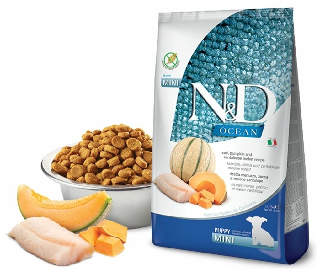 Farmina N&D Ocean корм для щенков мелких пород беззерновой треска тыква и мускусная дыня (800 г) Корм сухой Farmina N&D Dog Ocean с треской тыквой и дыней для щенков мелких пород 800 г