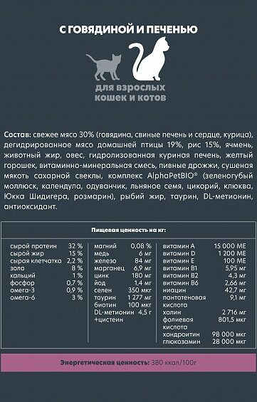 AlphaPet корм для кошек с говядиной и печенью (400 г) Корм сухой AlphaPet Superpremium с говядиной и печенью для взрослых домашних кошек и котов 400 г
