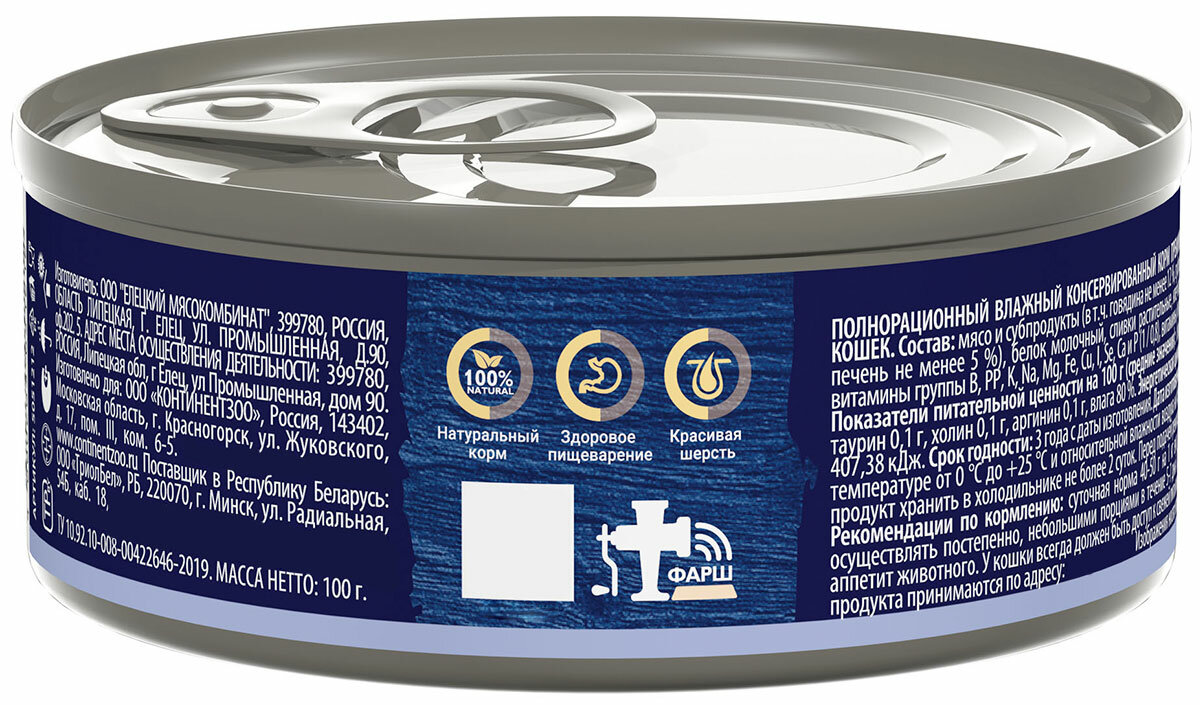 | Состав | Состав: мясо и субпродукты (в т.ч. говядина не менее 12 %, субпродукты говяжьи не менее 12 %, курица не менее 10 %, печень не менее 5 %), белок молочный, сливки растительные, клетчатка, гидролизат куриного белка, масло растительное, витамины группы B, РР, K, Na, Mg, Fe, Cu, I, Se, Са и Р (1 / 0,8), витамины (питательные добавки на 100 г): А 500 МЕ, D3 50 ME, Е 5 МЕ. |