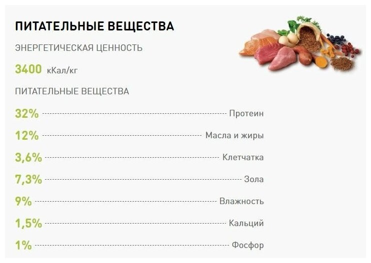 | Состав | СОСТАВ Дегидратированное мясо (индейка 20%), рис 19%, пшеница, ячмень, картофельный белок, кукурузный глютен, животный жир, целлюлоза, сушеный жом свеклы, фруктоолигосахариды (fos) 1%, сушеный жом цикория 1%, сухой яичный продукт, пивные дрожжи, льняное семя, рыбий жир 1%, подсолнечное масло 1%, фосфат натрия, хлорид калия, Юкка шидигера 0.1%, биологический комплекс растительных экстрактов 0.03% (фенхель, куркума, гвоздика, цитрусовые, виноград, розмарин), глюкозамин (100 мг/кг), хондроитин сульфат (100 мг/кг). |