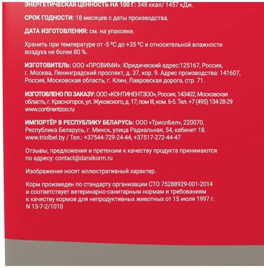 | Состав | Состав: пшеница цельнозерновая, мясная мука, продукты переработки злаков, гидролизованная печень, жир животный, кукурузное масло, комплекс витаминов (А, В4, Д3, Е, В3,В5, В2, В1, В6, В9, В12) и минералов (калий, цинк, железо, марганец, медь, йод, селен), свекольная пульпа, дрожжи, антиоксидант. Пищевая ценность: сырой протеин 22%, сырой жир 8%, сырая клетчатка 3,5%, сырая зола 7,5%, Са - 1,3%, Р - 1,0%. Энергетическая ценность на 100 г |