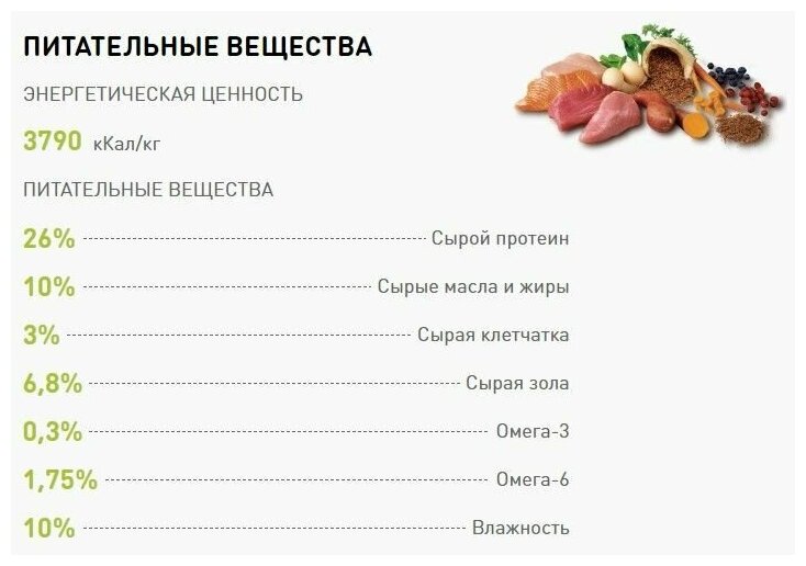 | Состав | Ингредиенты: сушеное мясо (индейка 15%), кукуруза, рис 15%, пшеница, кукурузная мука, рыбная мука, сушеный жом свеклы, животный жир, рыбий жир 1.2%, фруктоолигосахариды - ФОС 1%, сушеный цикорий, целлюлоза 1%, кукурузный глютен, сухие дрожжи, сушеные яичные продукты, кальция фосфат, хлорид калия, хлорид натрия, Юкка шидигера, глюкозамин (400 мг/кг), биологический комплекс растительных экстрактов (гвоздика, цитрусовые, виноградная лоза, розмарин, куркума) 0.03%, хондроитин сульфат (100 мг/кг). |