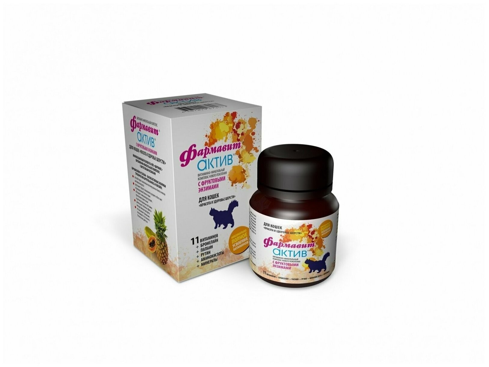 Комплекс витаминов, аминокислот и минералов нормализует обмен веществ, поддерживает баланс витаминов и минеральных веществ в организме взрослых кошек, устраняет нарушения в развитии кожно-шерстного покрова. Фруктовые энзимы – бромелайн и папаин – восполняют дефицит пищеварительных ферментов в организме, улучшают усвоение питательных и биологически активных веществ.
