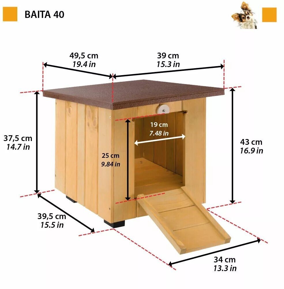 Будка для маленьких собак Также подходит для кроликов Изготовлена из сертифицированной FSC™ древесины северной сосны, которая поступает из ответственно управляемых лесов, а также из других контролируемых мест происхождения лесоматериала. Древесина обработана специальной краской для обеспечения прочности и стойкости Используются нетоксичные краски без запаха и на водной основе, чтобы здоровье вашего питомца не пострадало Пластиковые ножки для большей изоляции от земли Безопасная дверца Сдвижная крыша для лёгкой уборки Система вентиляции: вентиляционная решётка обеспечивает превосходный обмен воздуха внутри, предотвращая образование сырости Компактная конструкция с квадратным основанием Внутренние размеры (Д = длина, Ш = ширина / глубина, В = максимальная внутренняя высота). BAITA 40: Д 32 х Ш 37,5 х В 32 см Размеры дверцы: 19 х 25 смКрасивый и компактный маленький домик Baita 40 подходит для собак мелких пород, но также Вы сможете разместить в нем милых маленьких кроликов в Вашем саду. Он изготовлен из северной сосны, сертифицированной по схеме FSC™ и добываемой только в лесах, легально и ответственно управляемых лесозаготовительными предприятиями, в соответствии со строгими экологическими, социальными и экономическими стандартами, а также в других контролируемых местах происхождения лесоматериала. Он идеально подходит для использования на улице: древесина обработана особым способом, который гарантирует стойкость и сопротивление к любым погодным условиям, а также, превосходный комфорт несмотря на время года. Нетоксичная, экологически чистая, защищающая от плесени краска-герметик устойчива к УФ-лучам и отталкивает воду. Краска наносится по технологии \flow-coating\. Будка Baita 40 имеет практичные пластиковые ножки, благодаря чему она хорошо изолирована от земли, и сдвижную крышу, которая легко открывается и закрывается для уборки. Входная дверь имеет ступенчатую структуру, которая также может использоваться как лестница. Имеет специальный замок безопасности. Ну и наконец, система вентиляции обеспечивает превосходный внутренний обмен воздуха, предотвращая образование сырости, обеспечивая сухую окружающую среду для Вашего четвероногого друга.