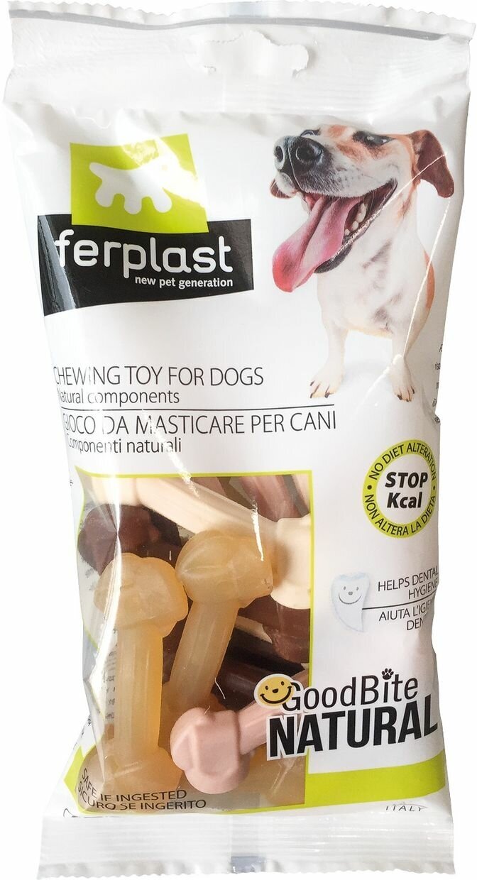 Жевательная игрушка для собак с натуральными компонентами Укрепляет зубы собаки и поддерживает гигиену полости рта Не меняет рацион собаки, можно использовать для снятия стресса и в качестве развлечения Безопасна при попадании внутрь организма Не имеет срока годности Нетоксичный и полностью биоразлагаемый продукт Выполнен в форме кости и имеет разные вкусы для большего интереса Упаковка содержит кости с разными вкусами: говядина, злаки, курица и ветчина Выпускается в двух размерах XS: 16 костей по 15 г каждая S: 8 костей по 40 г каждаяАссортимент продуктов Goodbite Natural от Ferplast предлагает разнообразные жевательные игрушки, изготовленные из натуральных компонентов, нетоксичные и биоразлагаемые, разработанные и протестированные таким образом, чтобы стать максимально безопасным продуктом для вашего питомца. Они безопасны при проглатывании и не нарушают рацион собаки. Их можно использовать как игрушку для снятия стресса. Они легко удовлетворят жевательный инстинкт вашей собаки и способствуют гигиене полости рта. Благодаря механическому жевательному действию, они уменьшают образование зубного камня и укрепляют зубы. При случайном попадании в организм они абсолютно безопасны, так как при контакте со слюной и желудочной кислотой превращаются в желеобразную массу. Продукт подходит как для щенков, так и для взрослых собак. Эти игрушки в форме костей представлены различными вкусами: говядина, злаки, курица и ветчина и поставляются в экономичной упаковке по 16 или 8 штук. В этой линейке вы также найдете жевательные игрушки в форме спирали, предназначенные для поддержания гигиены зубов собаки, или палочки.