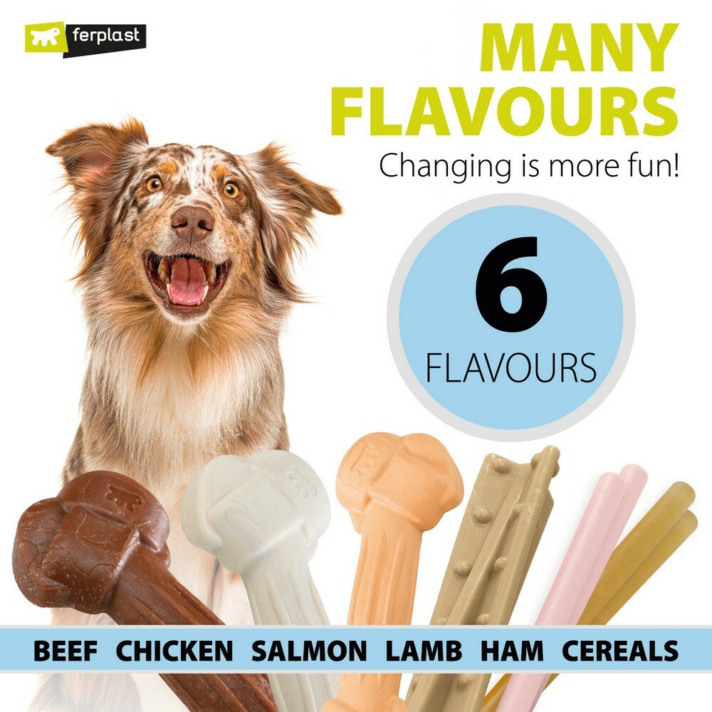 Жевательная игрушка для собак с натуральными компонентами Укрепляет зубы собаки и поддерживает гигиену полости рта Не меняет рацион собаки Игрушка для снятия стресса и развлечения собаки Безопасна при попадании внутрь организма животного Не имеет срока годности Нетоксичный и полностью биоразлагаемый продукт Спиралевидная форма с различными вкусовыми добавками для повышения интереса Упаковка содержит игрушки с разными вкусами: говядина, злаки, курица и ветчина Выпускается в двух размерах S: 12 штук по 16 г каждая М: 10 штук по 23 г каждаяЗнакомьтесь! Полезный продукт для гигиены зубов вашего четвероногого друга! GoodBite Natural Helix от Ferplast – это полный ассортимент жевательных игрушек для собак, изготовленных из натуральных компонентов, нетоксичных и биоразлагаемых, которые заботятся о здоровье рта вашего питомца, не меняя его рацион: они были разработаны с учетом того, чтобы при попадании игрушки внутрь организма, метаболизм животного не менялся. Их можно использовать как игрушку для снятия стресса. Они прекрасно подходят для развлечения вашей собаки и удовлетворения жевательного инстинкта, а также укрепляют и очищают зубы. Благодаря механическому действию, совершаемому при жевании, уменьшается образование зубного камня. Особая форма спирали была специально разработана для улучшения гигиены зубов. Жевательные игрушки GoodBite Natural Helix при попадании в организм абсолютно безопасны и не вызывают закупорки кишечника: при контакте со слюной и желудочной кислотой они превращаются в желеобразную массу. Игрушки выпускаются в экономичной упаковке по 12 или 10 штук, с различными вкусами: курица, говядина, злаки и ветчина, что делает их более привлекательными для вашего питомца. В этой линейке вы также найдете жевательные игрушки в форме кости и палочек.