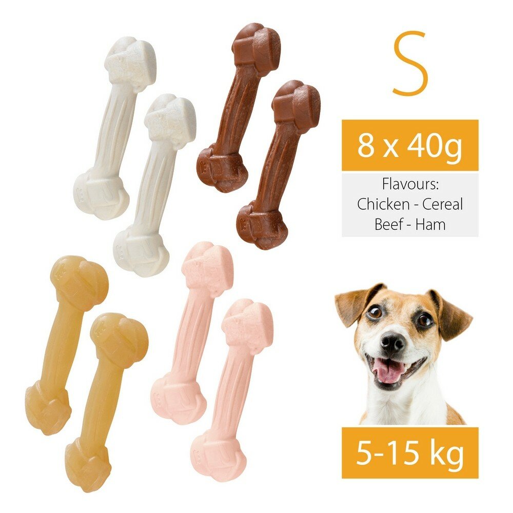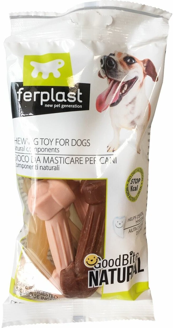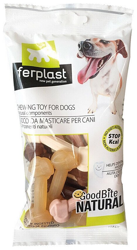 Жевательная игрушка для собак с натуральными компонентами Укрепляет зубы собаки и поддерживает гигиену полости рта Не меняет рацион собаки, можно использовать для снятия стресса и в качестве развлечения Безопасна при попадании внутрь организма Не имеет срока годности Нетоксичный и полностью биоразлагаемый продукт Выполнен в форме кости и имеет разные вкусы для большего интереса Упаковка содержит кости с разными вкусами: говядина, злаки, курица и ветчина Выпускается в двух размерах XS: 16 костей по 15 г каждая S: 8 костей по 40 г каждаяАссортимент продуктов Goodbite Natural от Ferplast предлагает разнообразные жевательные игрушки, изготовленные из натуральных компонентов, нетоксичные и биоразлагаемые, разработанные и протестированные таким образом, чтобы стать максимально безопасным продуктом для вашего питомца. Они безопасны при проглатывании и не нарушают рацион собаки. Их можно использовать как игрушку для снятия стресса. Они легко удовлетворят жевательный инстинкт вашей собаки и способствуют гигиене полости рта. Благодаря механическому жевательному действию, они уменьшают образование зубного камня и укрепляют зубы. При случайном попадании в организм они абсолютно безопасны, так как при контакте со слюной и желудочной кислотой превращаются в желеобразную массу. Продукт подходит как для щенков, так и для взрослых собак. Эти игрушки в форме костей представлены различными вкусами: говядина, злаки, курица и ветчина и поставляются в экономичной упаковке по 16 или 8 штук. В этой линейке вы также найдете жевательные игрушки в форме спирали, предназначенные для поддержания гигиены зубов собаки, или палочки.