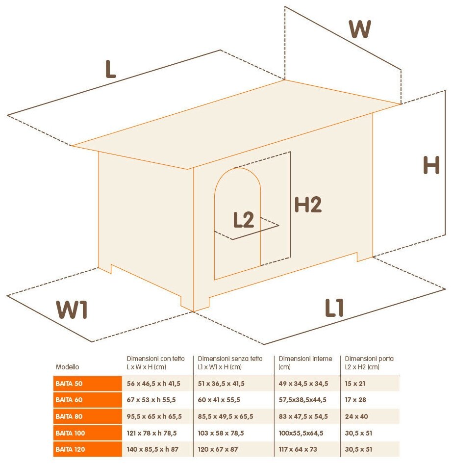 Изготовлена из высококачественной древесины северной сосны. Имеет сертификат FSC™ Крыша обработана специальным покрытием для долговечности Пластиковые ножки для изоляции от земли Металлический крючок для фиксации к клетке Аксессуары в наличии: пластиковая дверка из нетоксичного материала и водонепроницаемая подушка Jolly Внутренние размеры (L = длина, W = глубина, H = максимальная внутренняя высота): BAITA 50: L 49 x W 34,5 x H 34,5 см BAITA 60: L 57,5 x W 38,5 x H 44,5 см BAITA 80: L 83 x W 47,5 x H 54,5 см BAITA 100: L 100 x W 55,5 x H 64,5 см BAITA 120: L 117 x W 64 x H 73 смИдеальный вариант для вашего участка! Будка для собак Baita предназначена для использования на улице и изготовлена из древесины, сертифицированной по схеме FSC™ и добываемой только в лесах, легально и ответственно управляемых лесозаготовительными предприятиями, в соответствии со строгими экологическими, социальными и экономическими стандартами, а также в других контролируемых местах происхождения лесоматериала. Крыша слегка наклонена для стекания воды во время дождя. Как все деревянные будки от Ferplast, Baita имеет специальное покрытие для устойчивости к климатическим условиям. Baita оснащена пластиковыми ножками для изоляции от земли. Специальный металлический крючок обеспечивает фиксацию крыши к будке, а также позволяет открывать крышу для уборки. Если вы хотите утеплить будку, дополнительно вы можете приобрести пластиковую дверку и подушку Jolly cushion из материала high-tech, прочного и водонепроницаемого.