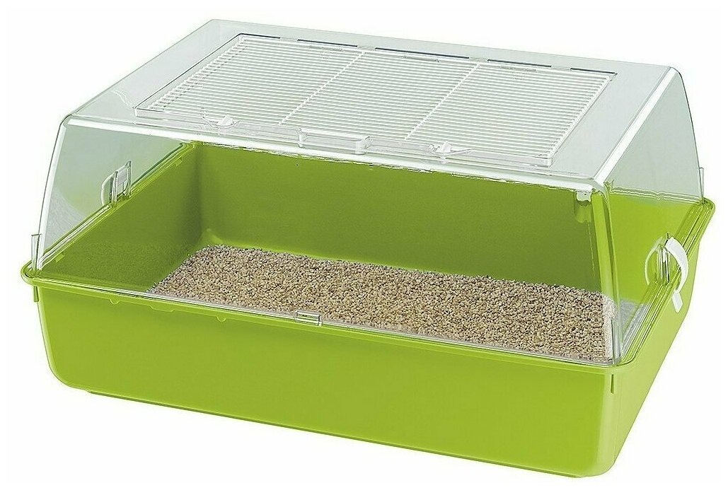 Отсоединив боковые клипсы, вы можете снять крышу и почистить клетку. Доступные цвета поддона: серый, синий и розовый.