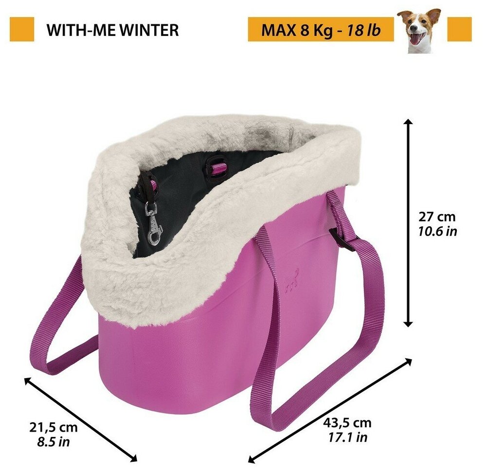 Мягкая переноска для маленьких собак With-Me изготовлена из инновационной резины - ЭВА (этиленвинилацетата). Идеально подходящая для осенне-зимнего сезона эта версия Winter имеет чехол из хлопчатобумажной ткани и мягкого искусственного меха. Эта сумка мягкая и удобная, она очень красива даже для использования в качестве сумки для шопинга. Произведенная в Италии, она предлагается в трех цветах: черный, фуксия или песочный. Благодаря прочным регулируемым ручкам, вы сможете носить ее как в руках, так и через плечо. Внутренний ремень безопасности может крепиться к ошейнику животного. Гигиеничный материал, моющийся и водонепроницаемый. With-Me может использоваться для переноски собак до 8 кг. Легкая в уходе, эта переноска легко моется с использованием воды и мягкого мыла. Чехол можно стирать при температуре 30° С. Вы также можете найти With-Me в стандартной версии без чехла, доступной в 6 модных цветах.Мягкая переноска для собак, изготовленная из EVА (этиленвинилацетата)Чехол изготовлен из искусственного меха Для маленьких собак с максимальный весом до 8 кгПрочные, регулируемые ручкиВнутренний ремешок безопасности в комплектеВодонепроницаема, моется водой и мылом Предлагается в модных цветах