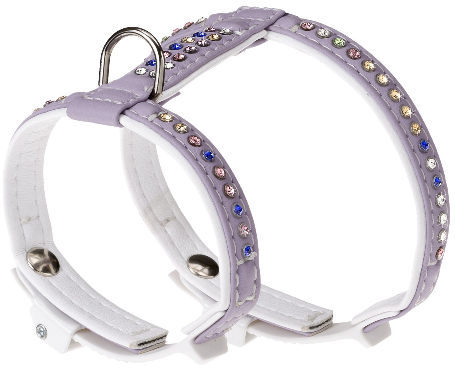 Шлейка для маленьких собак. Имеет небольшой вес и гламурный дизайн благодаря декору в виде разноцветных страз по всей длине ремешков. Быстро и легко надевается и снимается, благодаря простой системе замков, которая также дает возможность отрегулировать посадку с точностью до миллиметров.Выполнена из высокотехнологичной эко-кожи на хлопковой основе, которая по эксплуатационным характеристикам в несколько раз превосходит обычный кожзаменитель. Ремешки шлейки аккуратно сшиты из двух полос эко-кожи нежно-сиреневого и чистого белого цвета. Между ними расположена нейлоновая прокладка, к которой прикреплены стразы.Аксессуар выполнен с использованием специальных крепких ниток. Чтобы выдержать стиль, рекомендуем приобрести поводок этой же линейки. Модель доступна в 4-х размерах и 3-х расцветках: бирюзово-белый, бело-серый и сиренево-белый.Характеристики эко-кожи:- Высокая прочность на растяжение и разрыв;- Не провоцирует аллергических реакций;- Не впитывает воду и грязь и очень легко чистится;- Не теряет цвет и не становится твердым на морозе.Недостатки:- Нагревается на солнце;- Восприимчива к повреждениям острыми предметами.