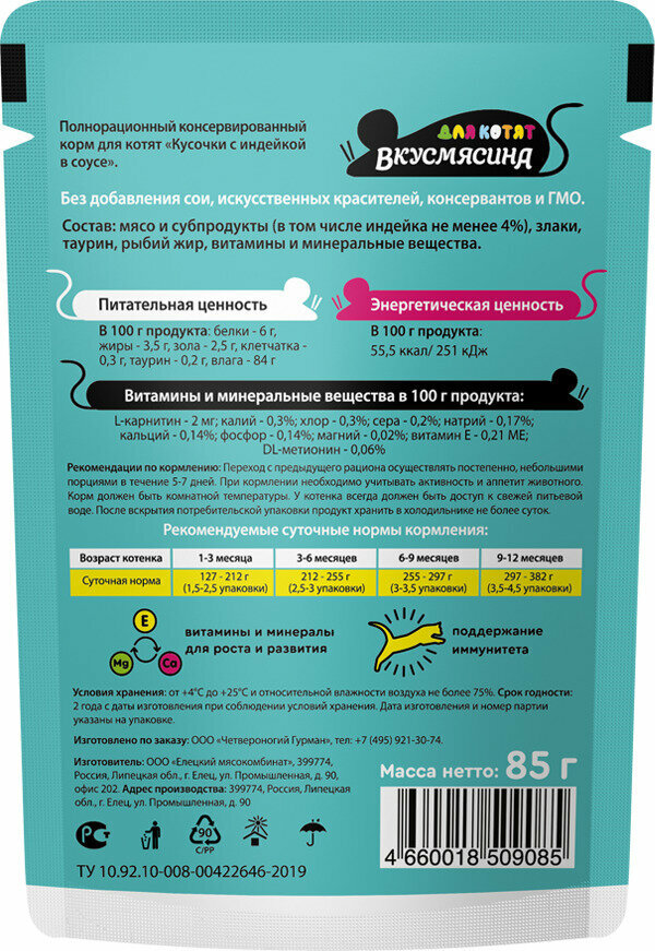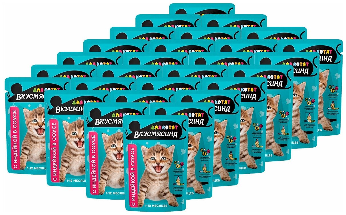 Вкусмясина влажный корм для котят кусочки с индейкой в соусе (85 г)