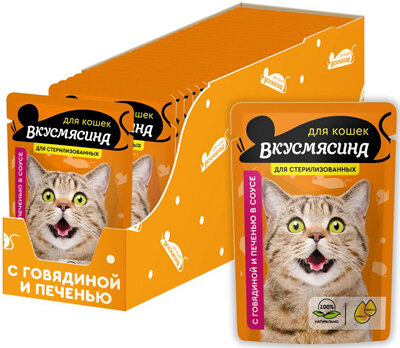 Вкусмясина влажный корм для стерилизованных кошек кусочки с говядиной и печенью в соусе (85 г) говядина, печень 85 г