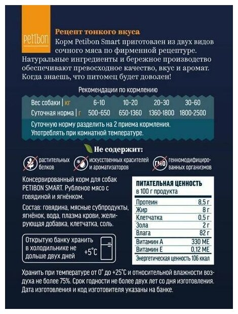 Консервы Petibon Smart для собак приготовлены из двух видов сочного мяса по фирменной рецептуре. Натуральные ингредиенты и бережное производство обеспечивают превосходное качество, вкус и аромат. В составе 92% мясных компонентов! Корма не содержат растительных белков, сои, ГМО, искусственных красителей и ароматизаторов. Petibon Smart - продуманный выбор!