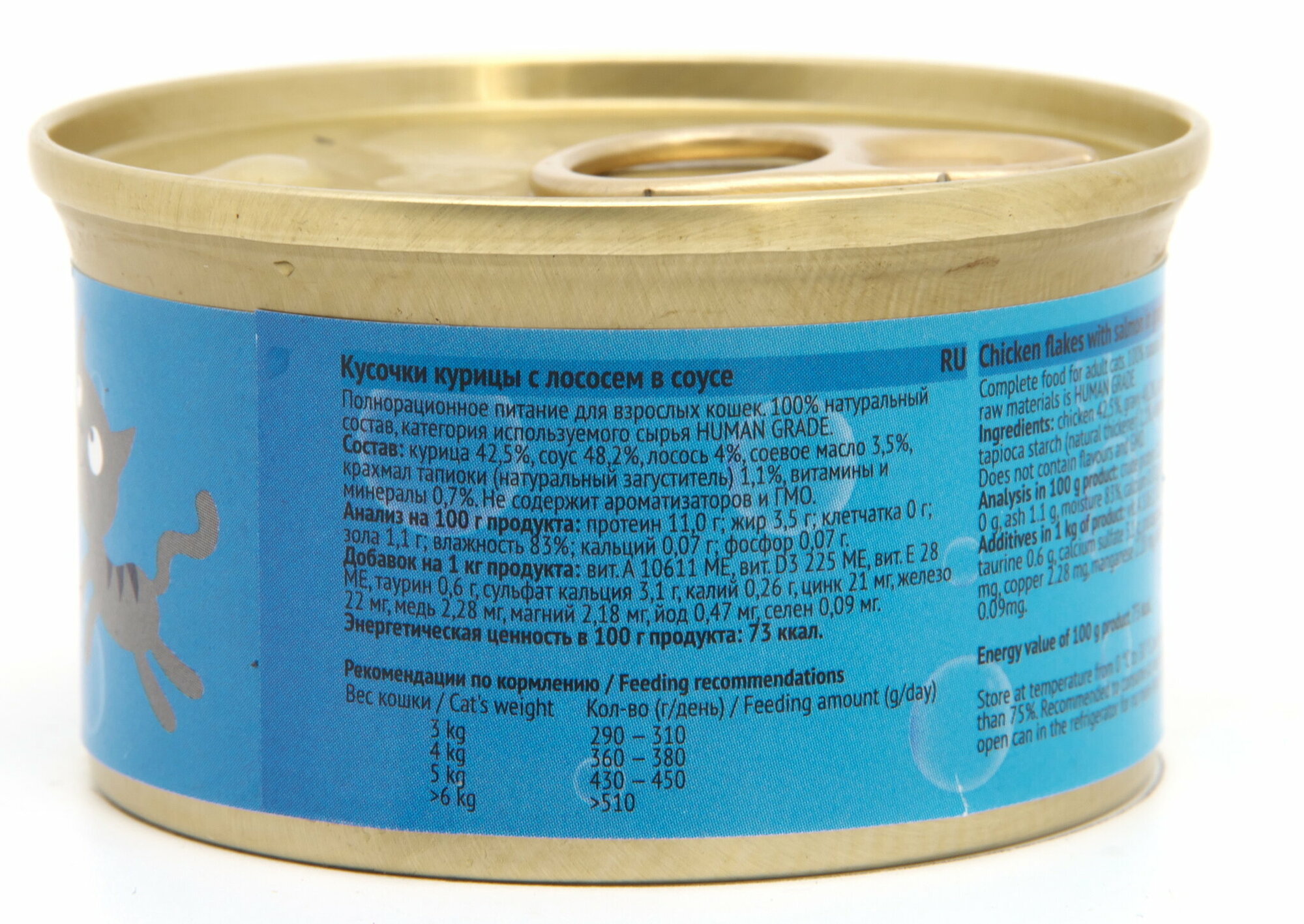 | Состав | Состав: курица 42,5%, соус 48,2%, лосось 4%, соевое масло 3,5%, крахмал тапиоки (натуральный загуститель) 1,1%, витамины и минералы 0,7%. Анализ на 100г продукта: протеин 11,0г; жир 3,5г; клетчатка 0г; зола 1,1г; влажность 83%; кальций 0,07г; фосфор 0,07г. Добавок на 1 кг продукта |