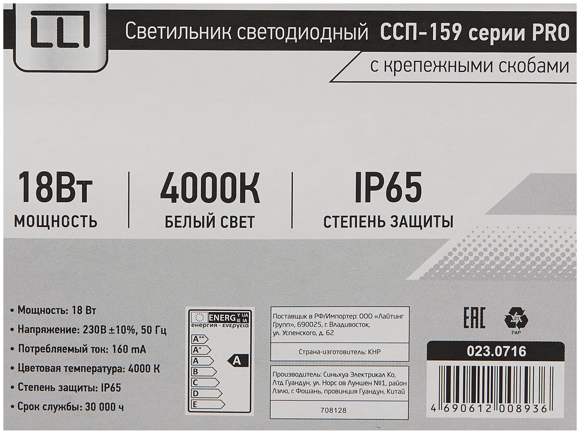 Светильник LLT герметичный ССП-159 18Вт 230В 4000К 1350Лм 640мм IP65 LLT 4690612008936