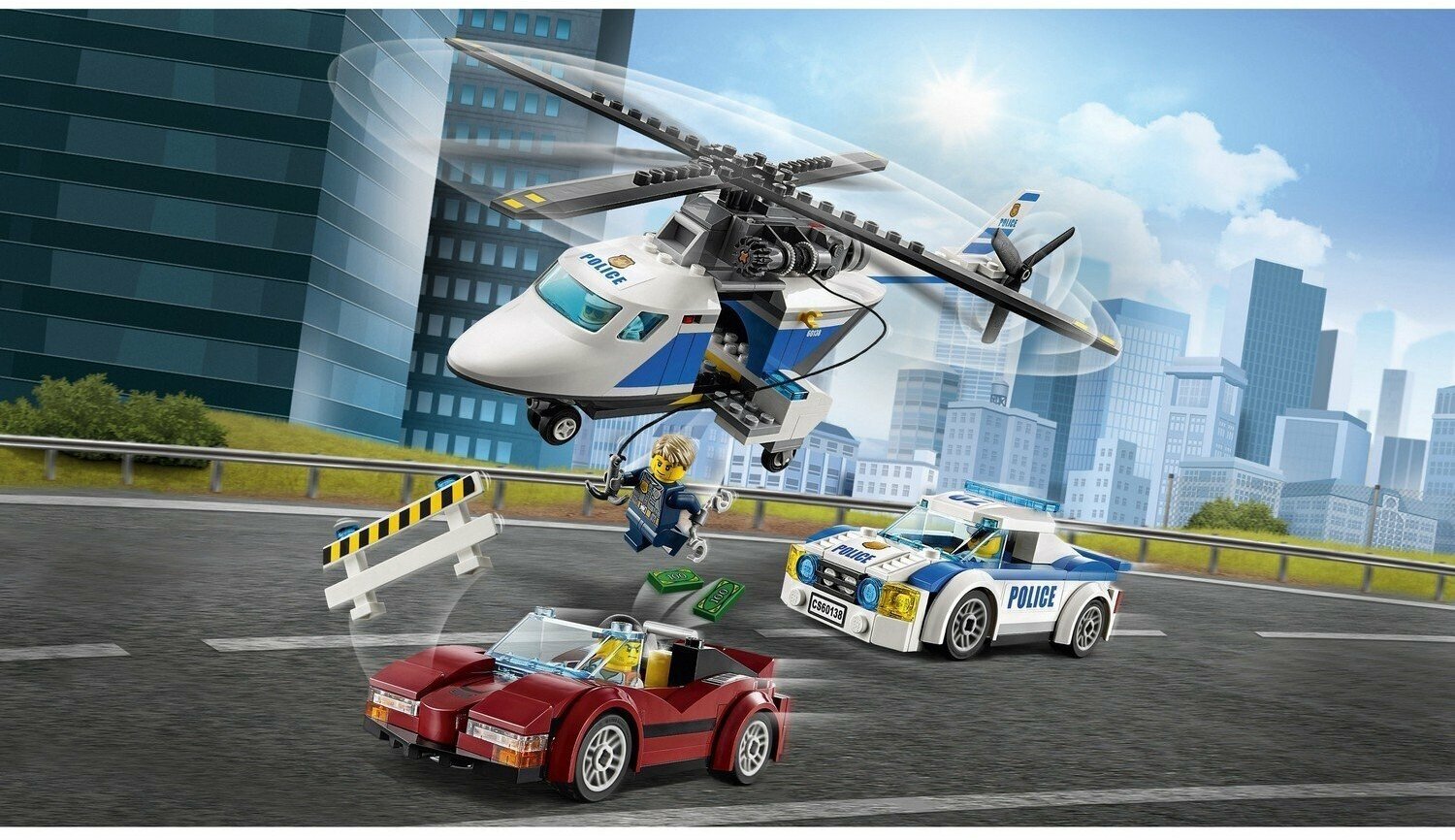 LEGO City Стремительная погоня - набор, который сможет заинтересовать подрастающего защитника. Скоро ему предстоит выбрать, какой профессиональной деятельности он посвятит свою жизнь. Вполне возможно, что оригинальный набор Lego станет идейным вдохновителем ребенка. У полицейских снова ответственная задача: предприимчивый вор украл деньги и золото, а теперь мчится из города, надеясь запутать след. Кажется, офицер один не справится, нужно подкрепление! Скорее вызывай вертолет, чтобы помочь бравому полицейскому произвести арест! Lego City - станьте гражданином игрушечного города.
