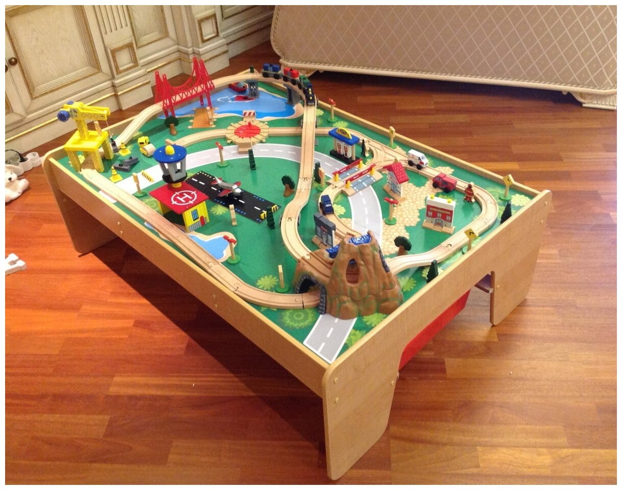 Реалистичная железная дорога от компании KidKraft, идущая в наборе с игровым столом, будет великолепным подарком для мальчика. Такая небольшая, но в то же время полезная деталь как стол избавит малыша от необходимости сидеть на полу и позволит полноценно погружаться в игровой процесс вместе с друзьями. В комплект железной дороги входит около 120 функциональных элементов, начиная от поездов и заканчивая станцией дозаправки, фигурками людей и даже подъемником. Все детали удобно хранить в компактных контейнерах из гипоаллергенного пластика. Стол укомплектован специальными бортами безопасностями, высотой 4 сантиметра, которые предотвращают падение и пропажу отдельных комплектующих. Железная дорога от известного бренда Kidkraft отлично сочетается с другими игрушками из серии Thomas & Friends и Brio.