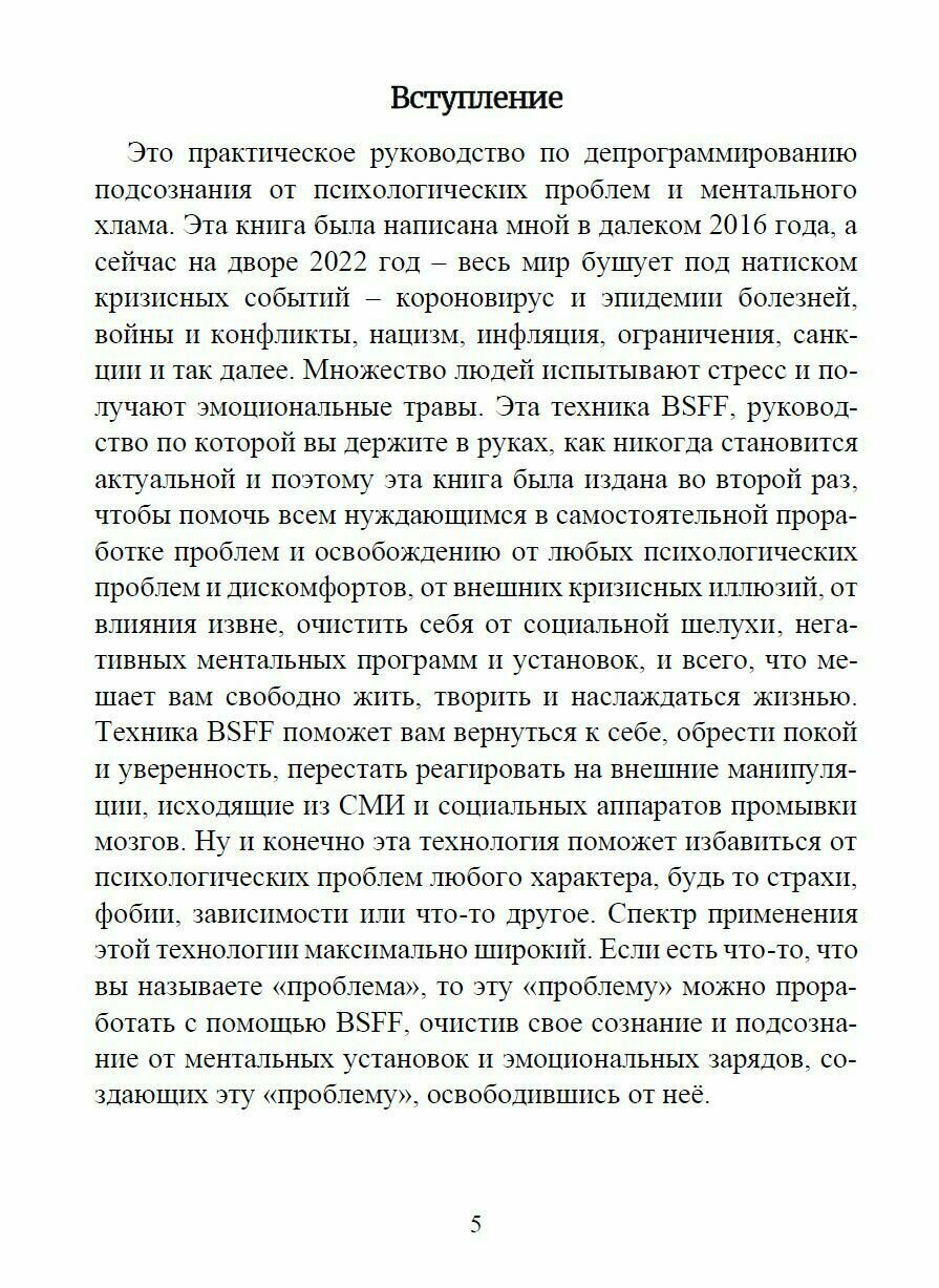 Это практическое руководство по депрограммированию подсознания от психологических проблем и ментального хлама. Техника BSFF (Be Set Free Fast), руководство по которой вы держите в руках, поможет в самостоятельной проработке и освобождению от любых психологических проблем и дискомфортов, очистить себя от социальной шелухи, негативных ментальных программ и установок, и всего, что мешает вам свободно жить, творить и наслаждаться жизнью. Техника BSFF поможет вам вернуться к себе, обрести покой и уверенность, перестать реагировать на внешние манипуляции, исходящие из СМИ и социальных аппаратов промывки мозгов. Ну и конечно эта технология поможет избавиться от психологических проблем любого характера, будь то страхи, фобии, зависимости или что-то другое. Спектр применения этой технологии максимально широкий. Если есть что-то, что вы называете "проблема", то эту "проблему" можно проработать с помощью BSFF, очистив свое сознание и подсознание от ментальных установок и эмоциональных зарядов, создающих эту "проблему", освободившись от неё. "Стань свободным быстро" - так звучит перевод названия этого метода с английского языка (be set free fast) и это же намерение эта технология поможет вам реализовать через данное руководство.