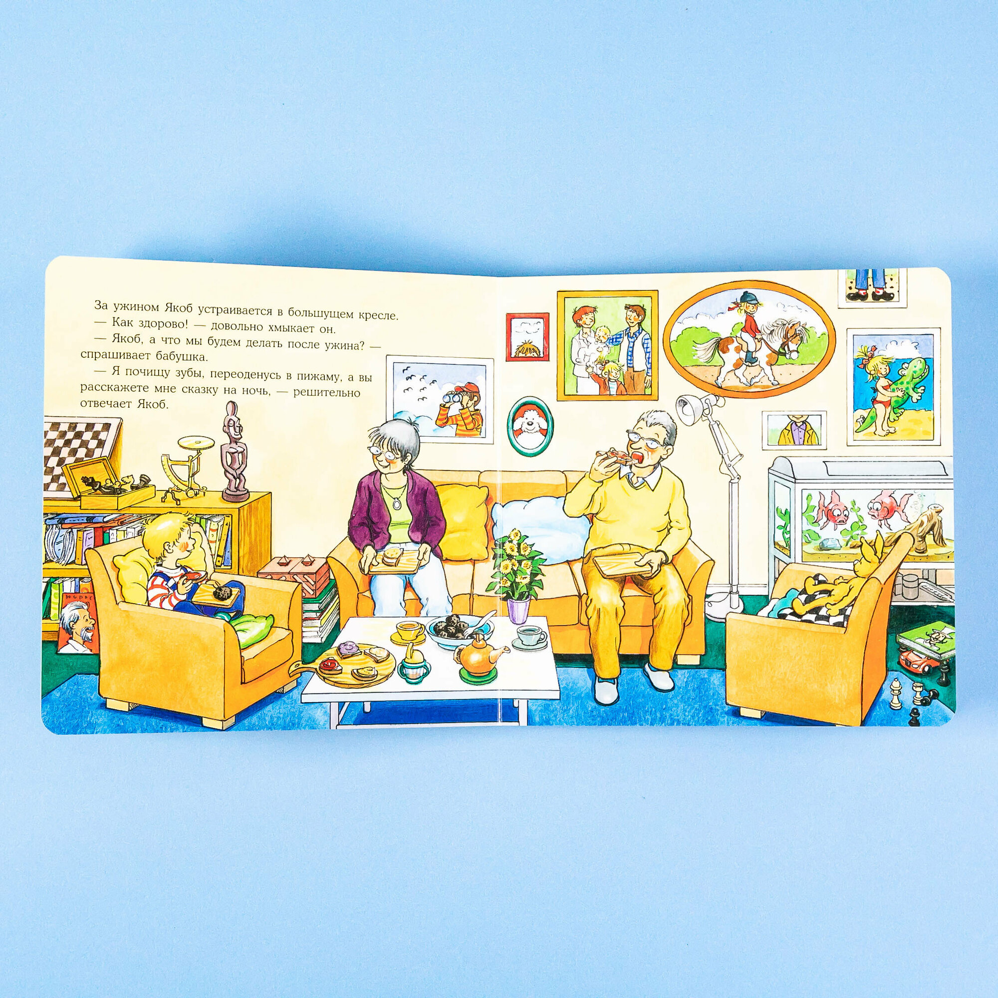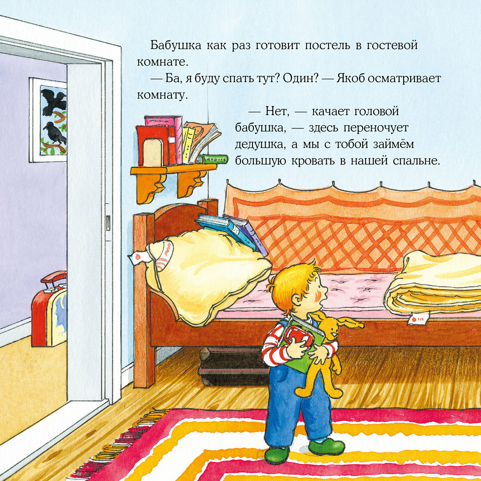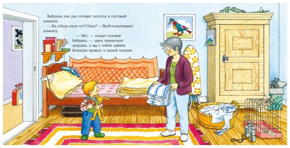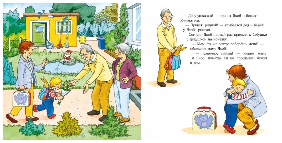 Малышам очень важно знать, что всё идёт по плану, а родители и другие близкие люди готовы позаботиться о них. Ночёвка у бабушки с дедушкой может стать отличным приключением, если подготовиться к ней заранее. Например, так, как это сделала мама Якоба: дала ему с собой любимую игрушку, привычную зубную щётку и предупредила, когда вернётся за ним. А Якоб ещё дома придумал, что будет делать у бабушки с дедушкой.