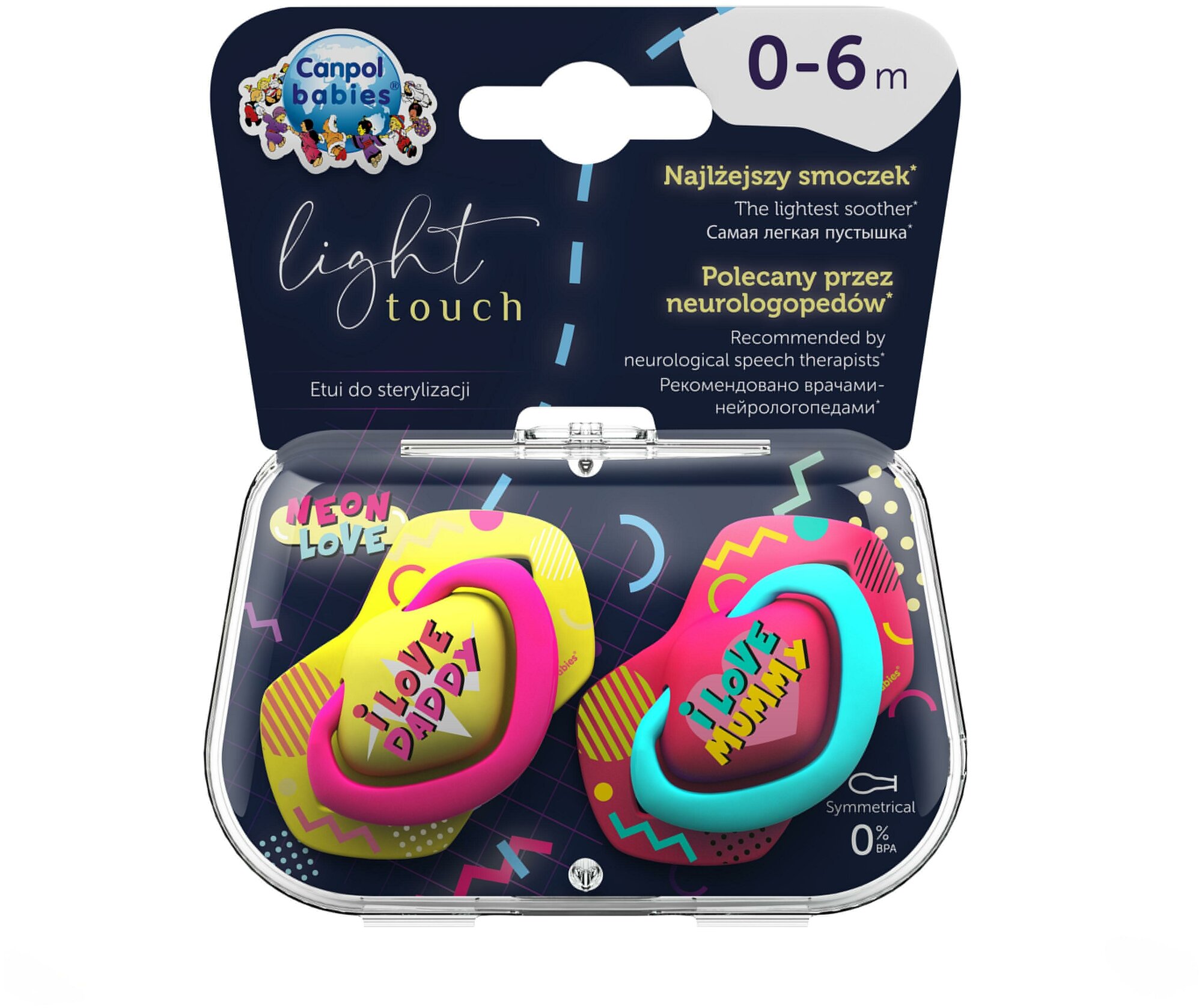 Пустышки Canpol Babies Neon Love были созданы для обеспечения максимального комфорта малышам. Мягкий силикон. Исключительно мягкий силикон требует меньше усилий при сосании. Легкое профилированное основание. По мнению 93% неврологических логопедов, принявших участие в исследовании компании Canpol в 22 году, легкое основание имеет важное значение для правильного развития полости рта ребенка. Не отягощает прикус и гарантирует легкое дыхание. Быстрая и удобная стерилизация. Пустышки легко содержать в чистоте благодаря современному футляру, который можно использовать не только для хранения, но и для быстрой и удобной дезинфекции в микроволновой печи. Немного воды и 2 минут достаточно, чтобы держать пустышки в гигиенической чистоте. Гипоаллергенный силикон. Пустышка изготовлена из 1% гипоаллергенного силикона. Устойчива к деформации. Не содержит Бисфенол А. Легкие сенсорные пустышки доступны в нескольких уникальных коллекциях и в различных размерах - они растут вместе с вашим ребенком. арт. 22/652*Рекомендовано специалистами в качестве первой пустышки для вашего малыша.*Сделано в Польше.*Бренд Canpol Babies уже более 25 лет помогает мамам во всем мире растить своих малышей здоровыми и счастливыми.