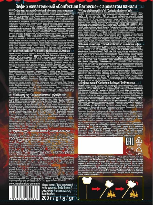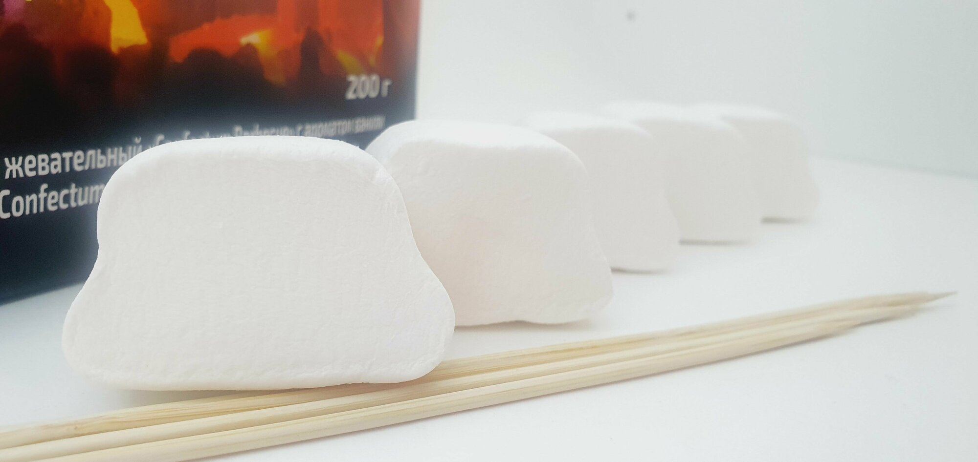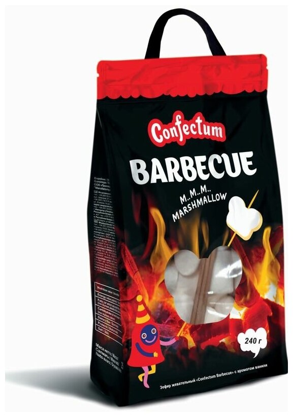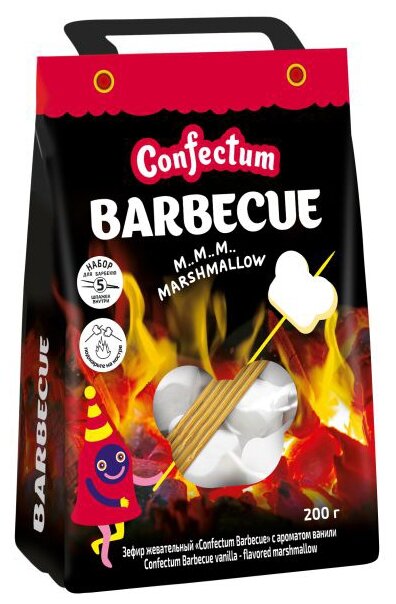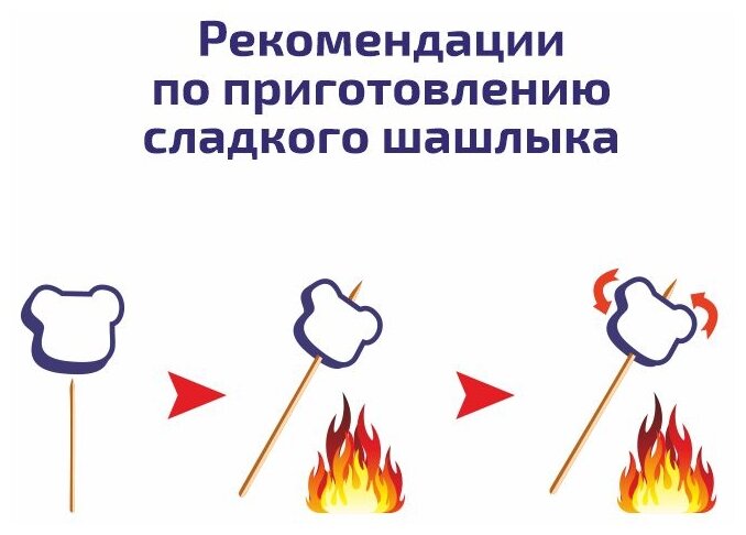 Зефир жевательный крупной формы в виде медвежонка с ароматом ванили, в бумажном пакете с бамбуковыми палочками. Продукт специально разработан для удобства приготовления над углями. Это любимое походное лакомство. Так же можно зажарить над остывающими углями шашлычок из нескольких зефиренок и подать его к чаю — очень необычный и интересный десерт: хрустящая румяная корочка с ароматом дымка и тягучая нежная сердцевина. Все, кто пробовал жарить маршмеллоу на костре, знают, насколько вкусный десерт получается. При нагревании сахар образует аппетитную карамелизованную корочку, а внутри маленькие зефирки плавятся и становятся тягучими и пористыми. Если вы не можете выехать на природу в ближайшее время, советую приготовить маршмеллоу дома в духовке, в микроволновке, на газовой плите или на свече. Если вы никогда не пробовали, надо обязательно это сделать. Проще блюда не придумаешь!