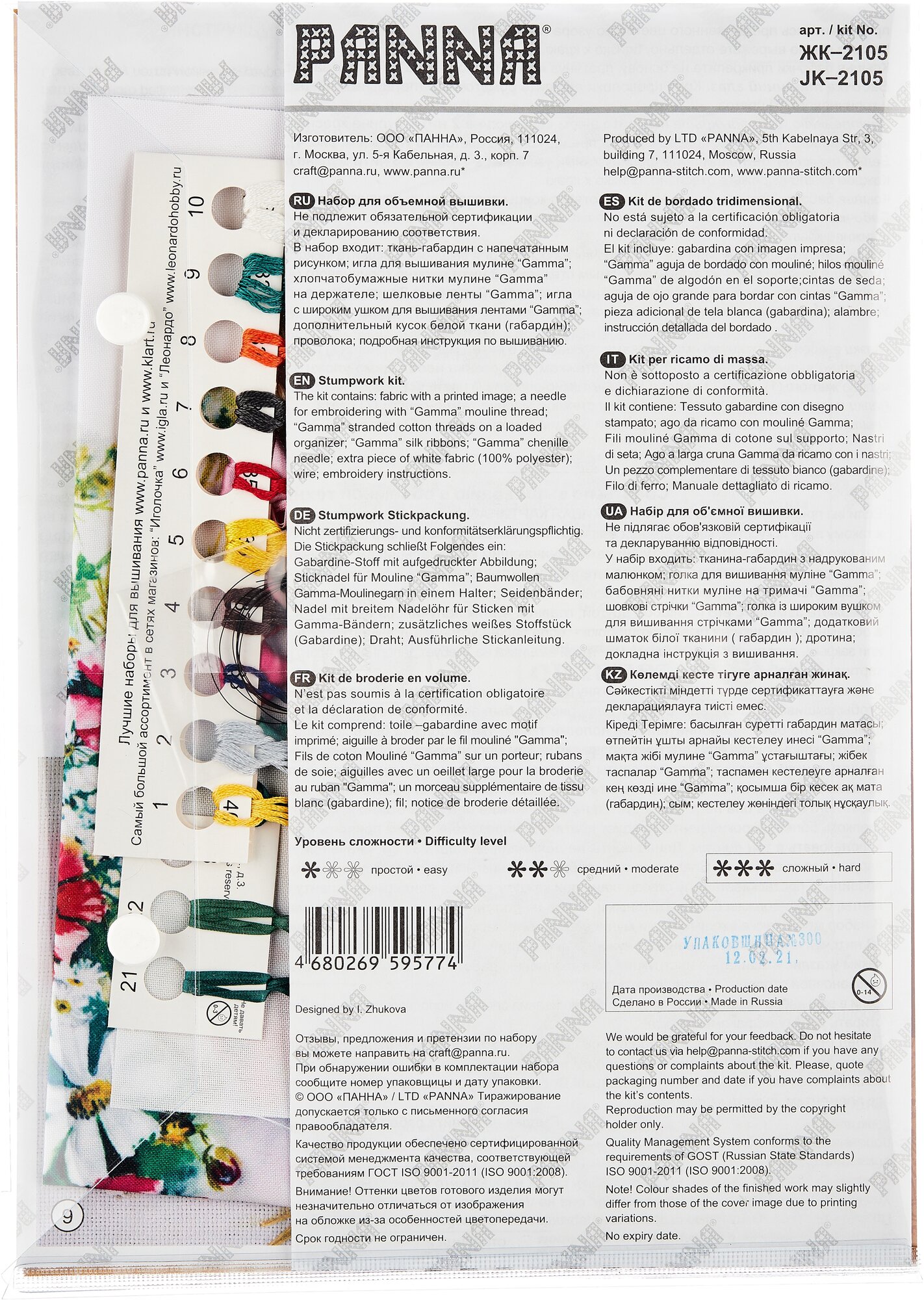 | Комплектация | ткань-габардин с напечатанным рисунком; шелковые ленты "Gamma"; хлопчатобумажные нитки мулине "Gamma" на держателе; игла с широким ушком для вышивания лентами "Gamma"; игла для вышивания мулине "Gamma"; подробная пошаговая инструкция с цветными фотографиями |