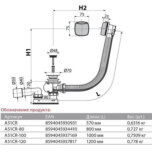 - Сифон для ванны AlcaPlast A51CRM автомат