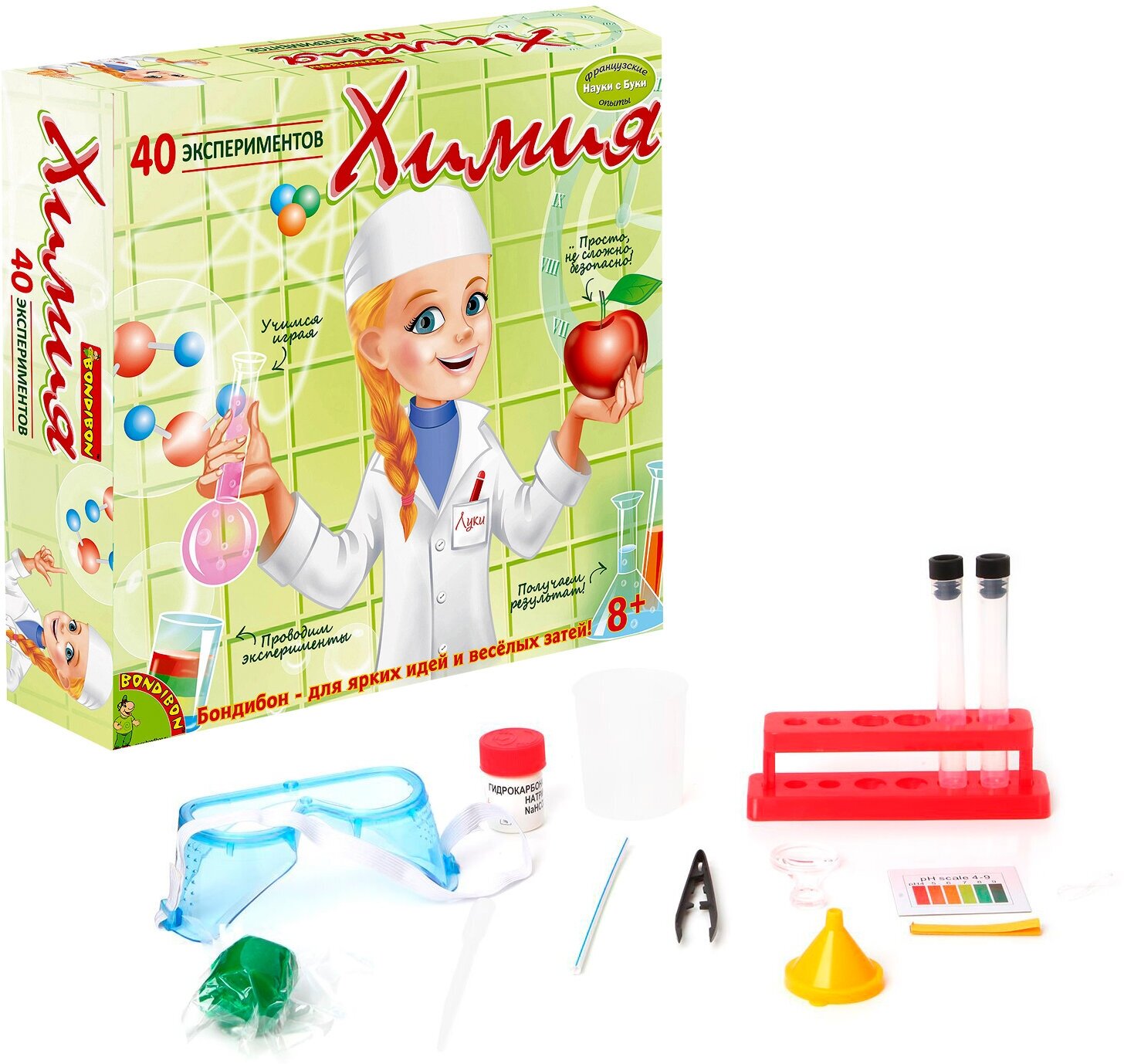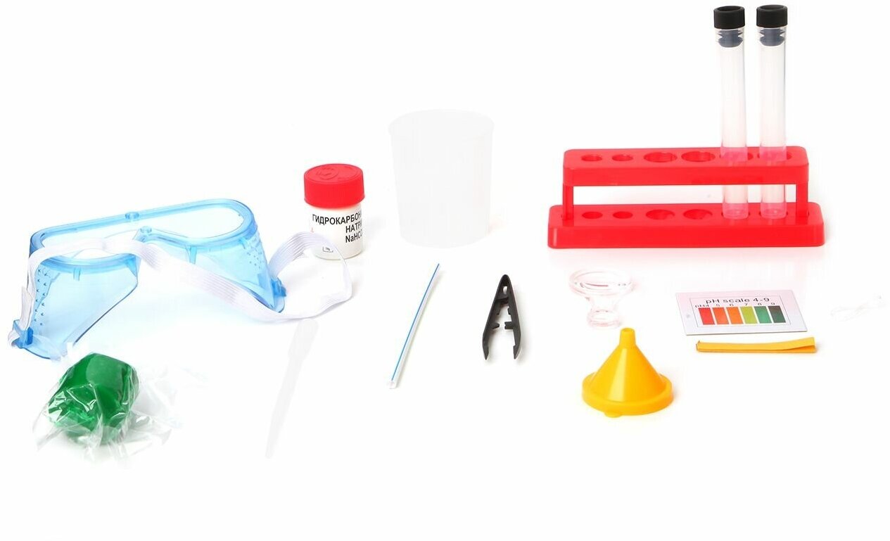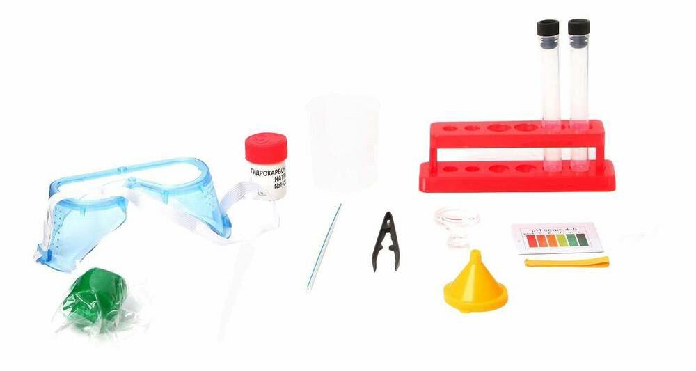 | Состав набора | иллюстрированная инструкция - 1 шт; подставка для пробирок - 1 шт; пробирки - 1 шт; пипетка - 1 шт; прозрачный стакан - 1 шт; воронка - 1 шт; шкала уровня ph - 1 шт; бумага ph - 1 шт; фильтровальная бумага - 1 шт; соломинка - 1 шт; резинка - 1 шт; гидрокарбонат натрия - 1 шт; защитные очки - 1 шт; пинцет - 1 шт; пластилин - 1 шт; увеличительное стекло - 1 шт; плакат - 1 шт |