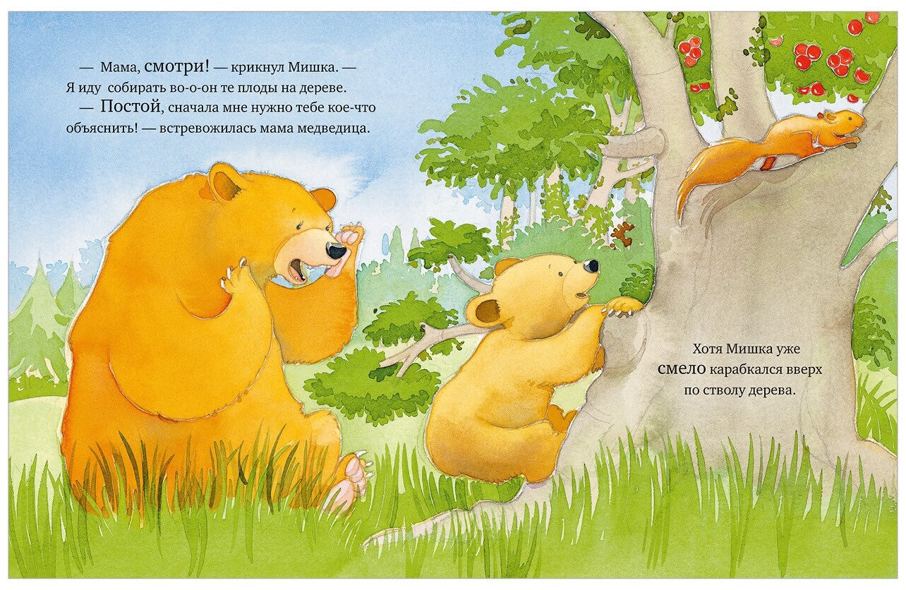 Мишка — очень любопытный медвежонок. Ему не терпится попробовать новое, не сидится на одном месте, и, конечно же, ему совсем некогда слушать советы мамы медведицы. Ведь столько всего захватывающего вокруг! Но когда у маленького Мишки что-то не получается, именно мама поделится опытом и поможет разрешить любую проблему.