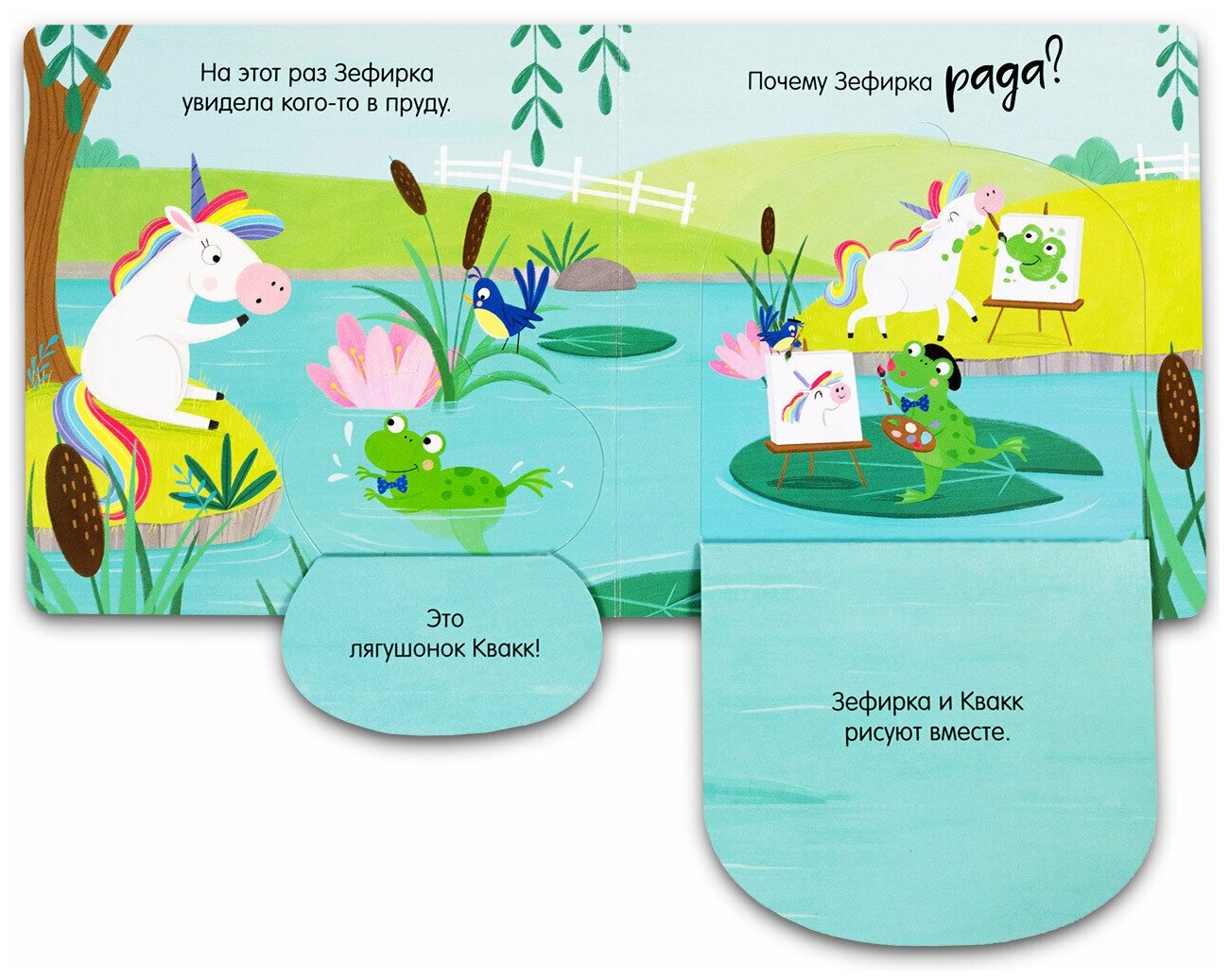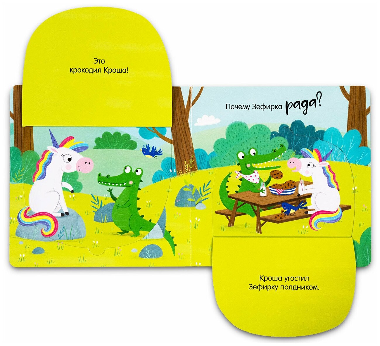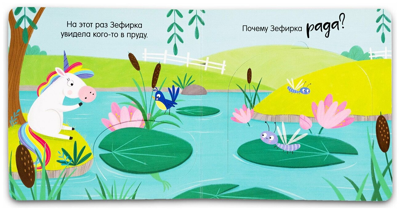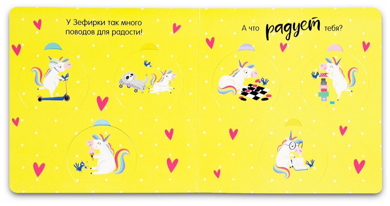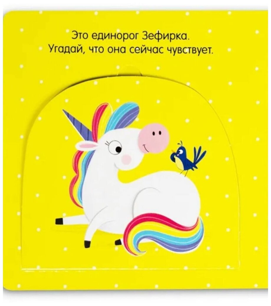 Книжка с окошками «Веселый единорог» идеально подходит для первого знакомства с эмоциями. Иллюстратор Самара Харди, которая знакома многим по детскому хиту «Дракоша», создала потрясающего персонажа Зефирку. Эта очаровательная единорожка оказывается в привычных для малыша ситуациях: встречает гостей, видит радугу или играет.