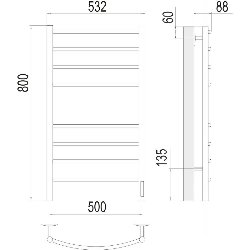 Конструкция полотенцесушителя Terminus (Терминус) Контур П7 500х800 состоит из труб квадратного профиля, что придает изделию строгий внешний вид. Устройство отличается большой мощностью нагрева, высокой надежностью соединений и долгим сроком службы. Прибор интегрируется в систему горячего водоснабжения или отопления.