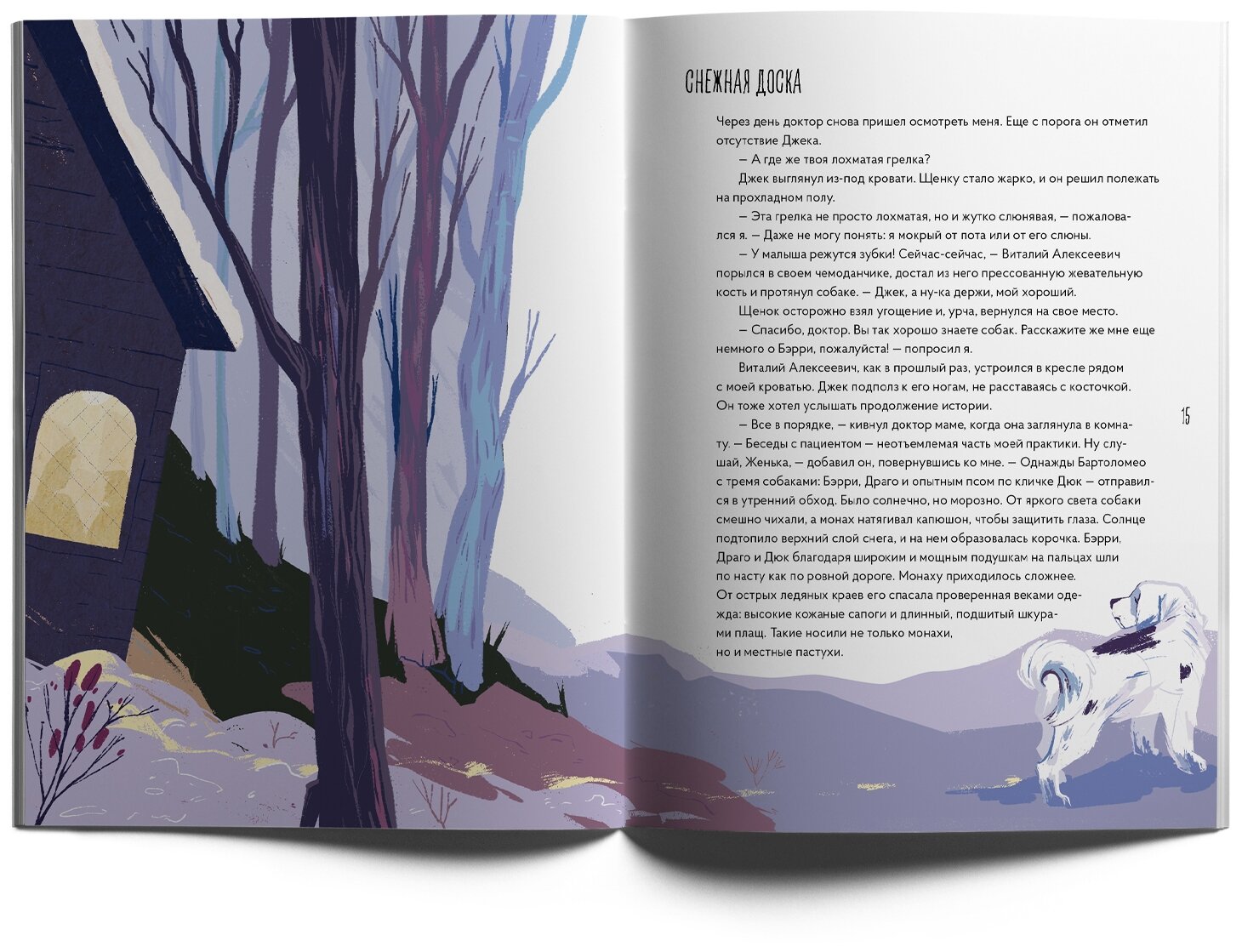 До восьми лет Женя, хозяин пушистого щенка по клич Джек, знал об Альпах только то, что там паслись лиловые коровы. Но когда мальчик заболевает, доктор и старый друг семьи рассказывает ему об удивительной собаке с перевала Сен-Бернар по кличке Бэрри. Бесстрашный и сильный он обладал уникальным чутьем и мог найти человека даже в буран.