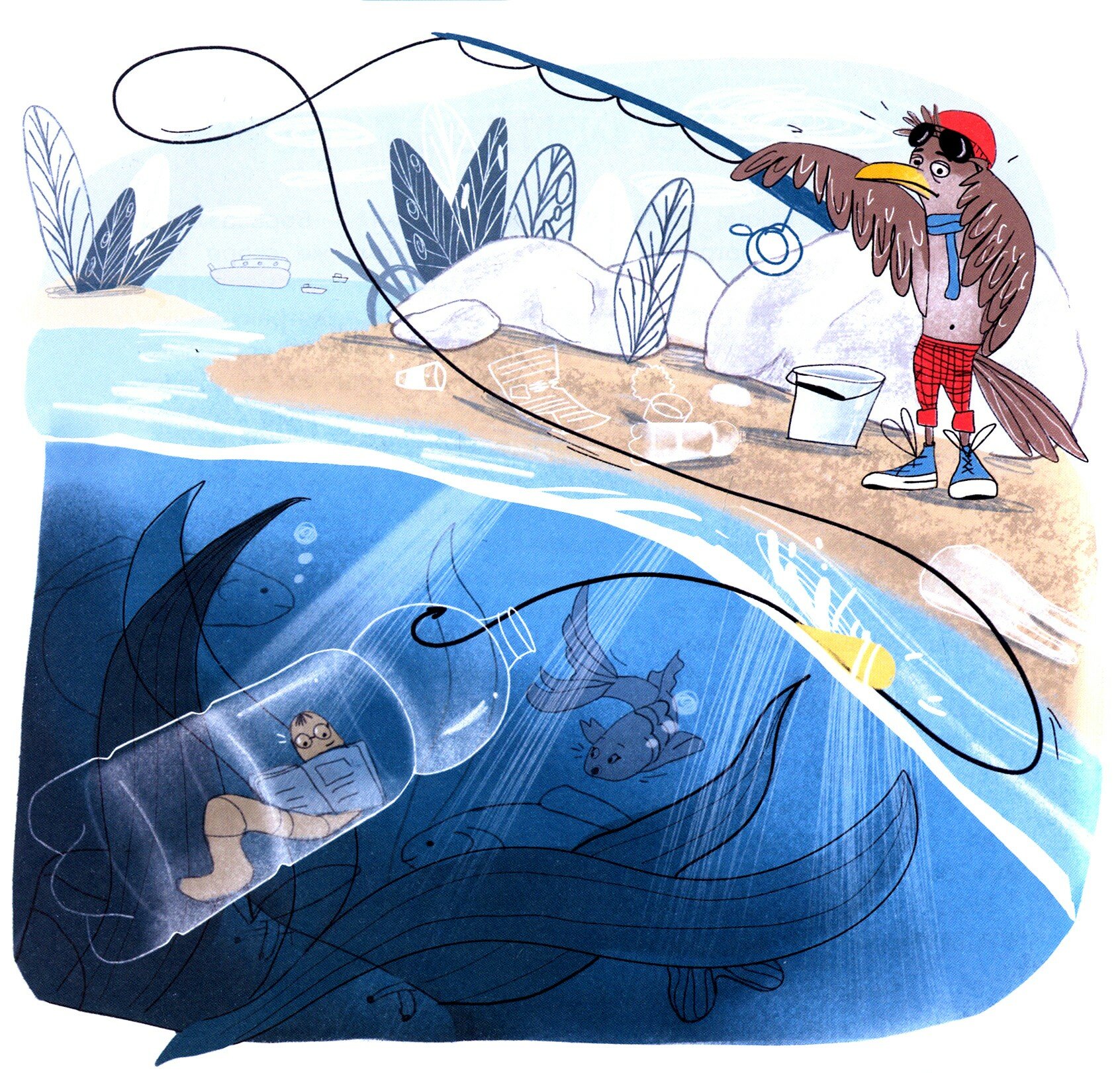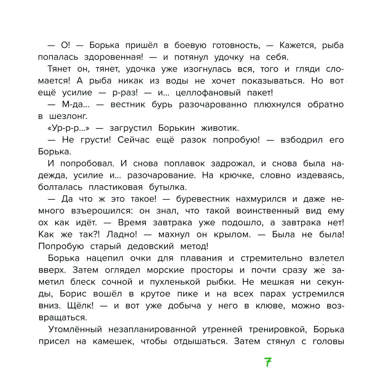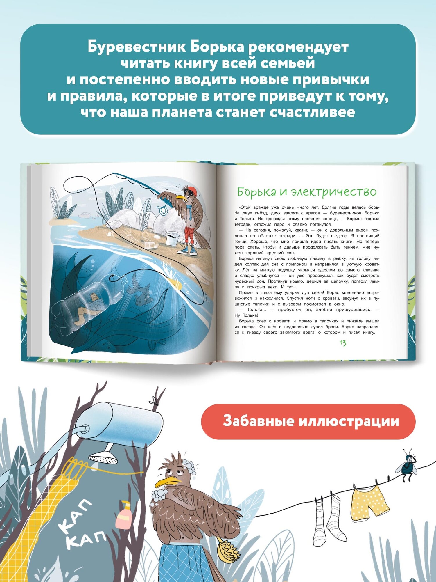 Очень хорошая книга. Во-первых, это не изложение сухих фактов, а история взглядом со стороны альбатроса Бори. Во-вторых, ребёнка привлекает автор в эту историю весьма одним простым способом. Боря предлагает стать каждому читателю этой книги - его подручным, его помощником и спасателем хрупкого мира природы! А кого больше всего любят дети в книгах, мультиках и фильмах?! Героев... А тут помощником связным предлагают быть сразу. Ребёнок ставит себя в позицию помощника героя. И бережно и ненавязчиво идут главы про разные аспекты природных ресурсов и их пределов. Наша планета больна, кашляет, чихает и страдает от расстройства желудка. Примеры и инструкции по переработке вещей, советы по кормлению птиц, экокроссворд и экоигры. Вот, что ждёт беспёрых друзей буревестника Бори!