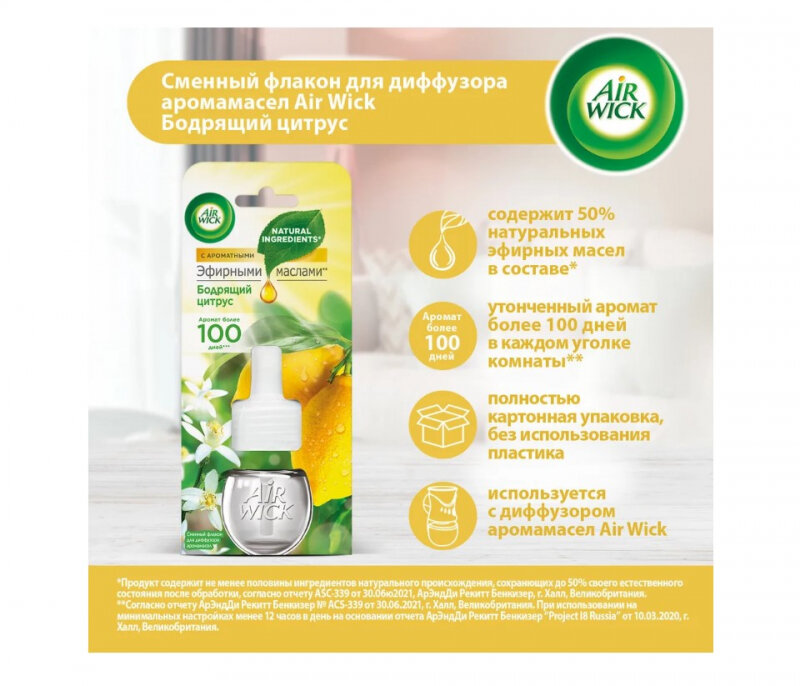 Диффузор аромамасел Airwick наполнит Ваш дом цитрусовым ароматом, вдохновленным самой природой, который длится день за днем. Ощутите заряд бодрости вместе с Air Wick!