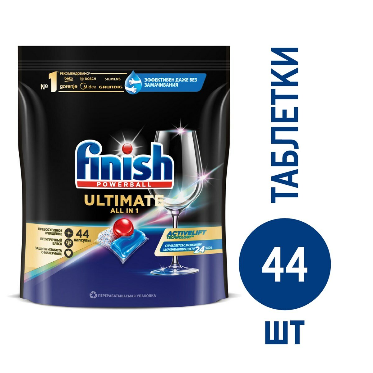Finish Ultimate All in 1 обеспечивает превосходное очищение и безупречный блеск с первого раза. Технология ACTIVELIFT эффективно справляется с засохшими загрязнениями даже спустя 24 часа без предварительного замачивания.