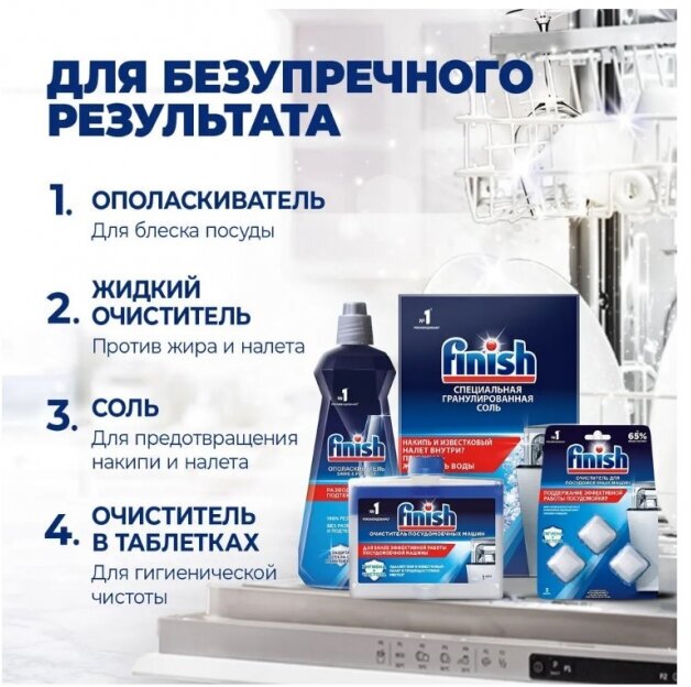Finish обеспечивает глубокое очищение и ослепительный блеск при каждой мойке. Компактная 3-камерная капсула эффективно справляется с различными видами сложных загрязнений даже без предварительного замачивания!