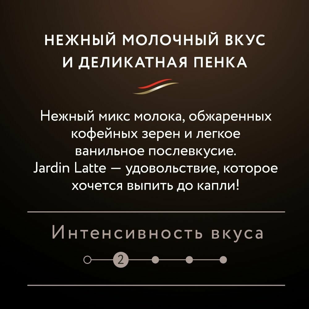 Нежный микс молока, обжаренных кофейных зерен и легкое ванильное послевкусие.Jardin Latte - удовольствие, которое хочется выпить до капли!