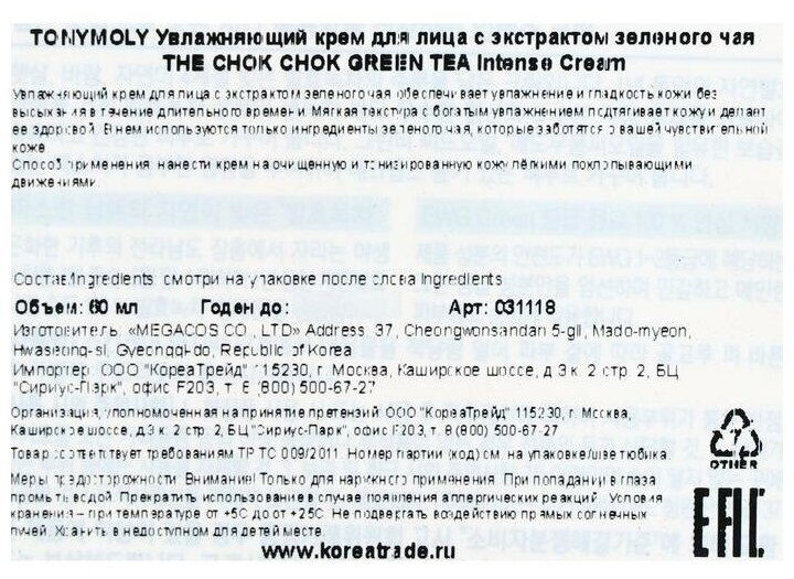 | Коллекция | TONYMOLY THE CHOK CHOK GREEN TEA Intense Cream |