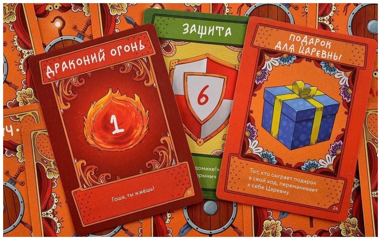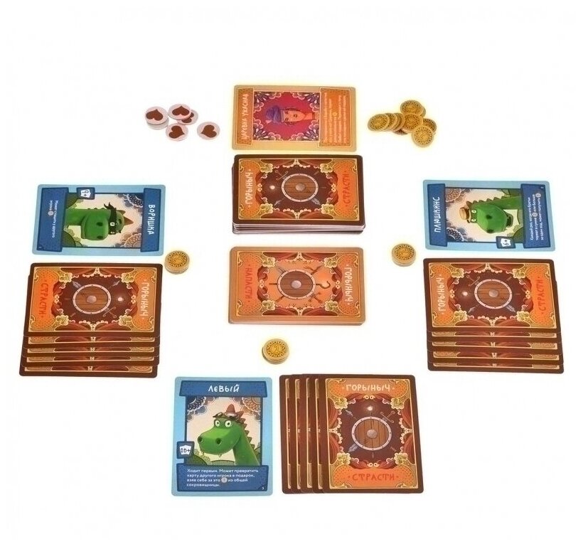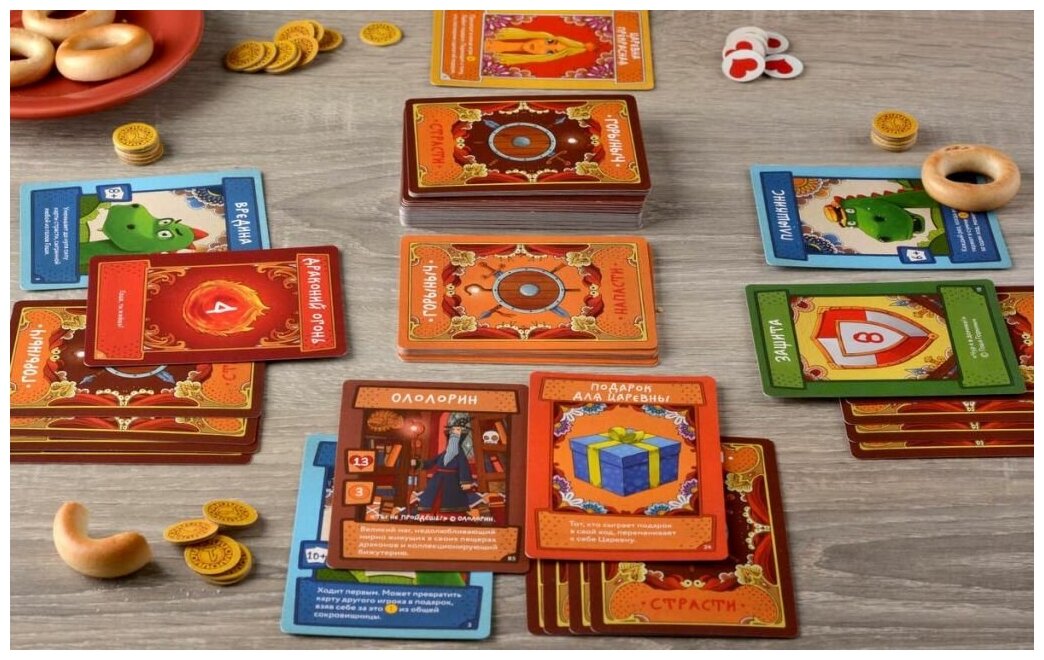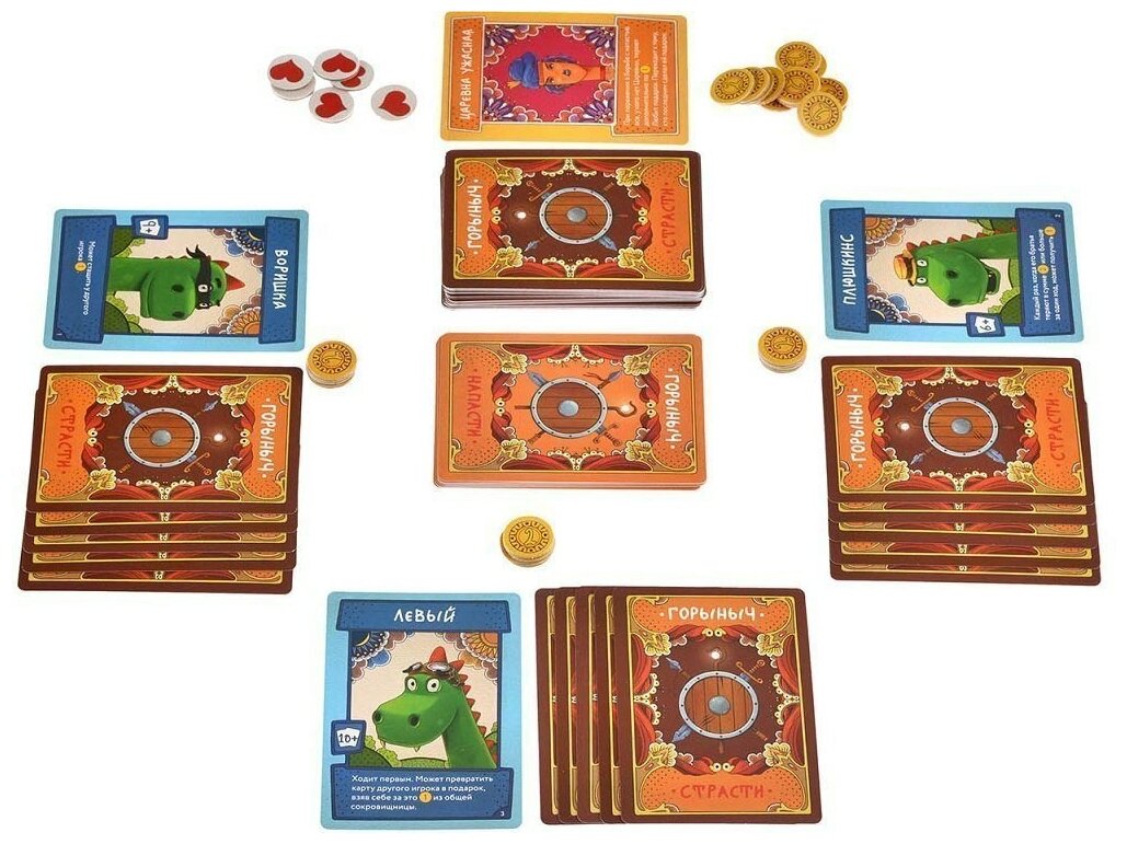 | Комплект игры | 9 карт персонажей (головы дракона), 3 двусторонних карты Царевен (итого 6 красавиц), арсенал боевого дракона:60 карт колоды "Страсти" (30 карт драконьего огня, 15 карт волшебства, 8 карт защиты, 7 карт подарков), 24 карты из колоды "Напасти"(18 карт отважных приключенцев, которых нужно победить, 6 карт нежданчиков, или форс-мажоров), 6 жетонов здоровья дракона Гоши, 24 монеты, правила игры |
