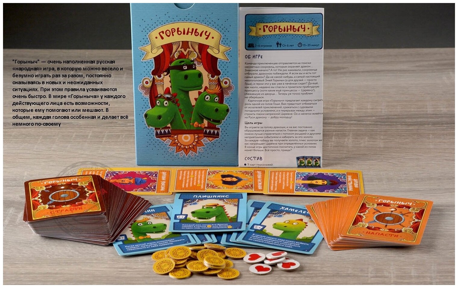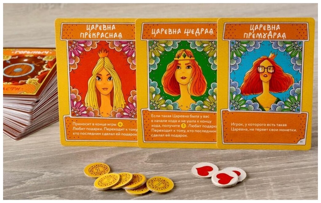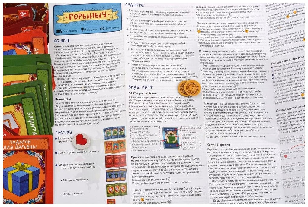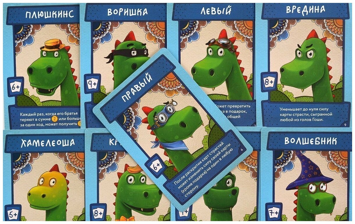 | Комплект игры | 9 карт персонажей (головы дракона), 3 двусторонних карты Царевен (итого 6 красавиц), арсенал боевого дракона:60 карт колоды "Страсти" (30 карт драконьего огня, 15 карт волшебства, 8 карт защиты, 7 карт подарков), 24 карты из колоды "Напасти"(18 карт отважных приключенцев, которых нужно победить, 6 карт нежданчиков, или форс-мажоров), 6 жетонов здоровья дракона Гоши, 24 монеты, правила игры |