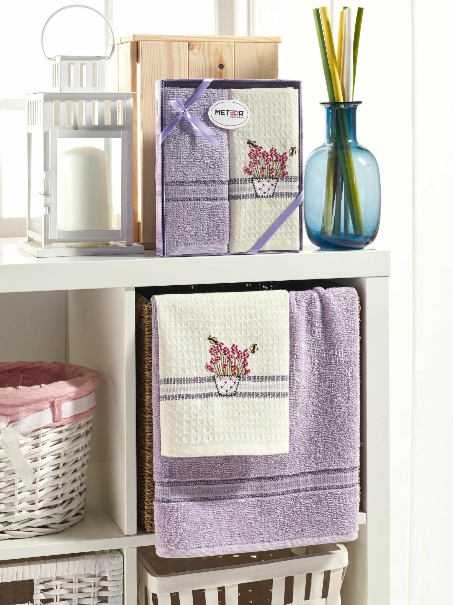 Комплект полотенец в нежных оттенках. Махровое полотенце в сиреневом цвете из пушистой махры средней плотности, вафельное полотенце кремового оттенка украшено цветочной нарядной вышивкой. Благодаря разной текстуре полотенец их можно использовать для работы с любыми поверхностями. Материал гипоаллергенный, отлично впитывает влагу и очень приятен на ощупь.