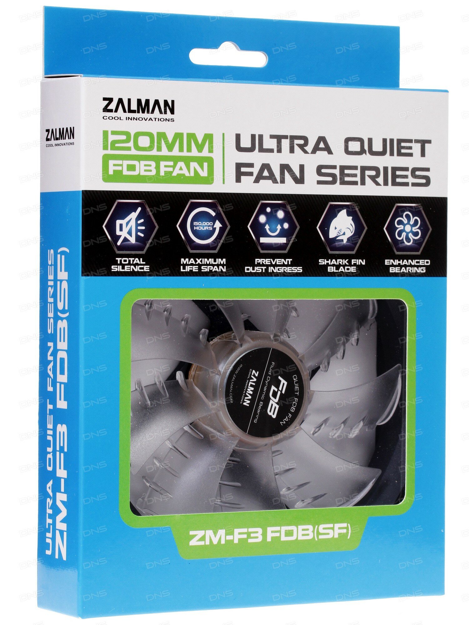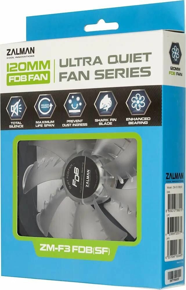 Размер кулера составляет 120х120х25 мм, а скорость вращения его лопастей – 1200 об/мин. Даже при постоянной работе ПК вентилятор будет эффективно выполнять охлаждение. Долговечность устройства и максимальную бесшумность работы гарантирует гидродинамический подшипник скольжения (FDB). Заявленное производителем время бесперебойной работы вентилятора составляет 150000 часов. ZALMAN ZM-F3 FDB (SF) – это вентилятор высокого качества.