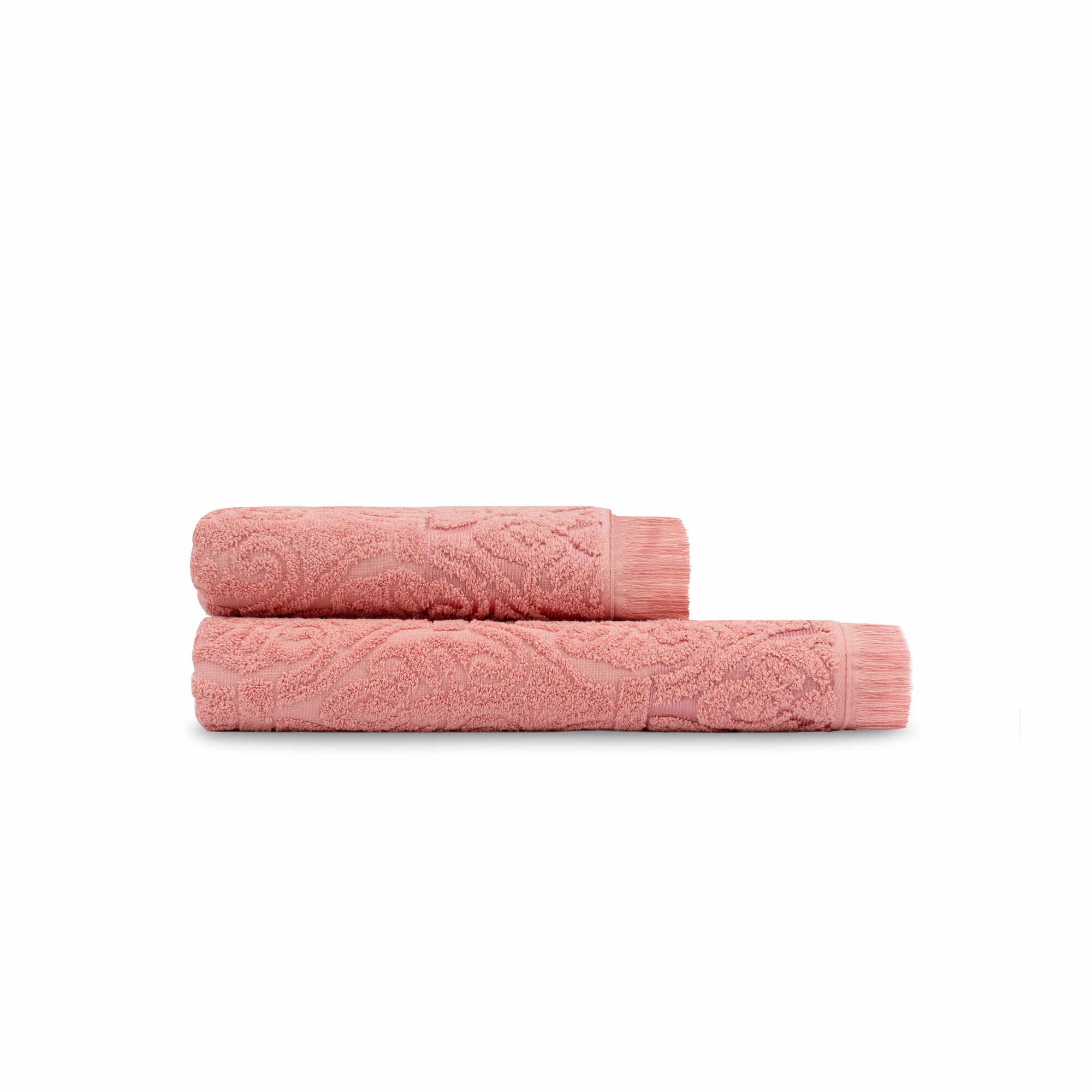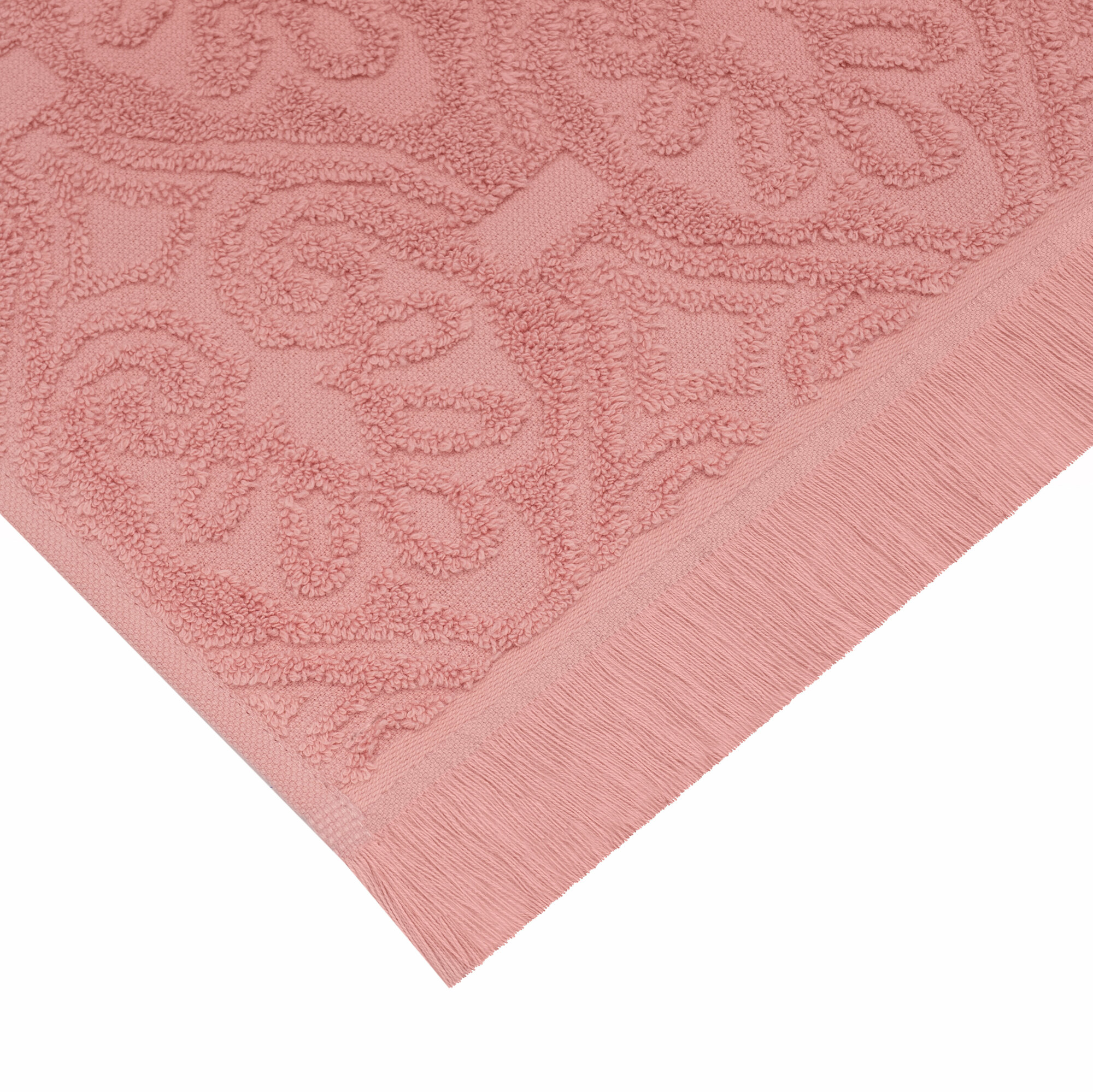 Полотенце украшено бахромой и жаккардовым узором.