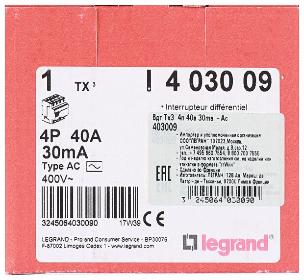 Выключатель дифференциального тока (УЗО) Legrand TX3 4п 25A 30mA тип AC GWB 2544 4п 25A